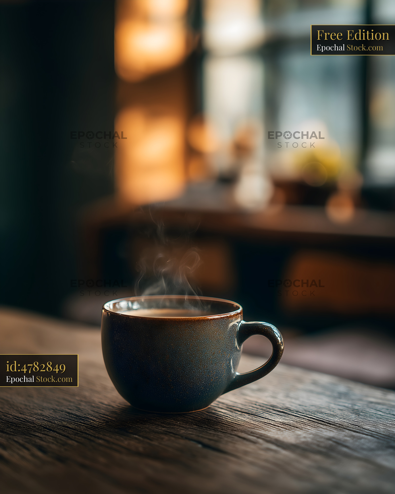 Coffee cup on table with steam rising in a warm setting Free Premium Stock Image