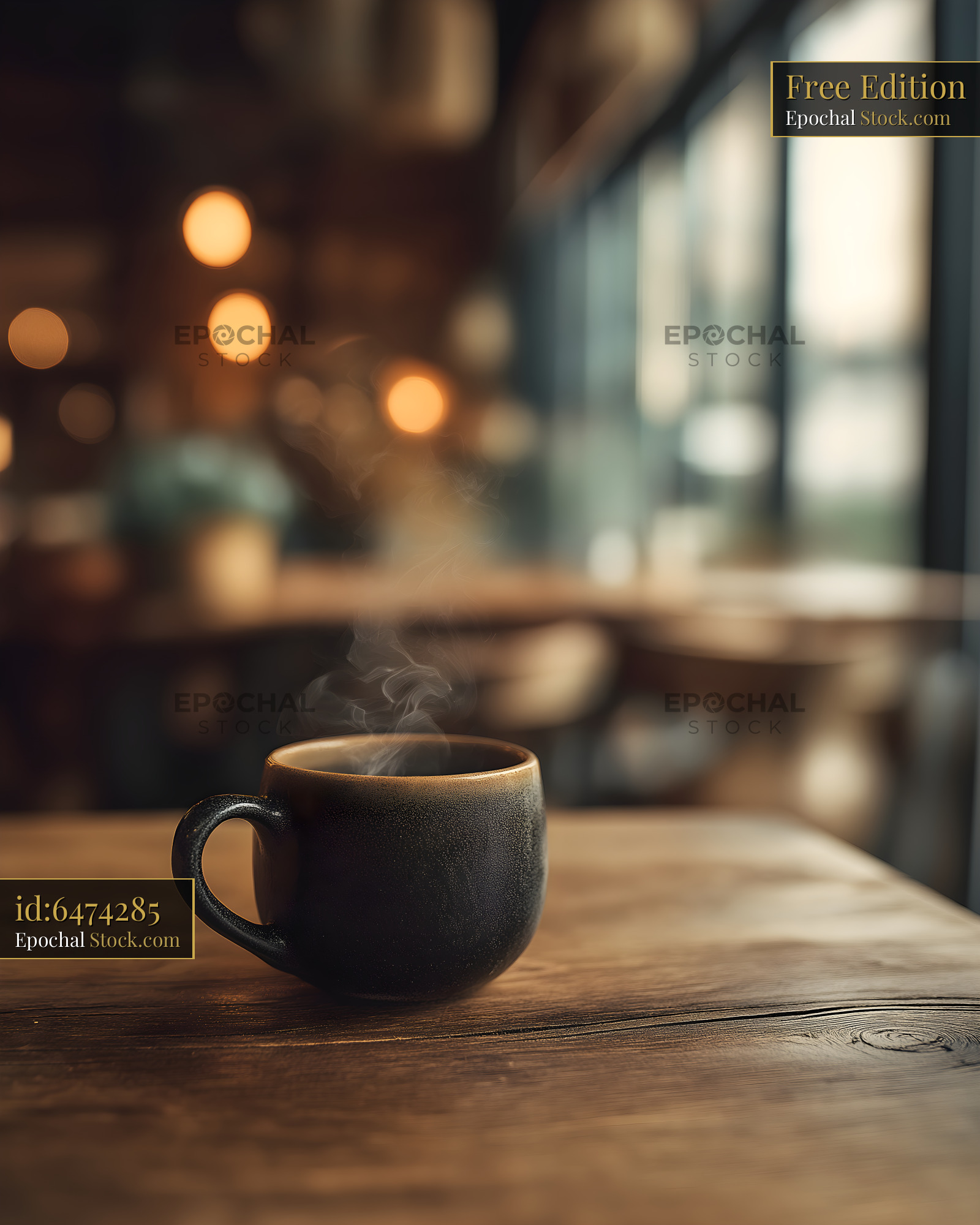 A black coffee cup rests on a wooden table. Steam rises from the cup in a cozy caf? filled with soft lighting. The scene shows a quiet moment inside the caf?.