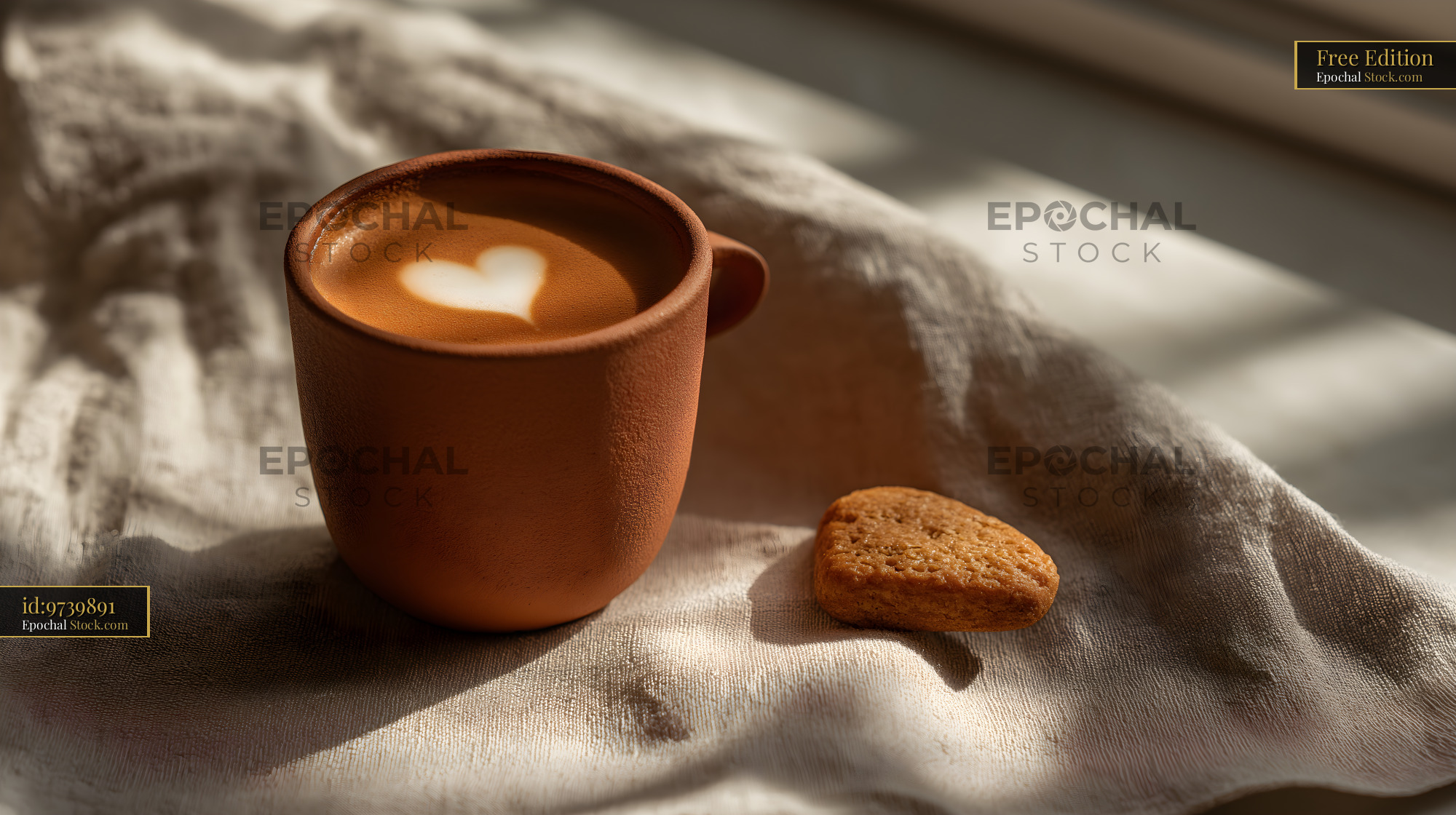 A coffee cup sits on a cloth with a heart design in the foam. Next to it is a small biscuit. Sunlight shines across the scene, creating soft shadows in the room.