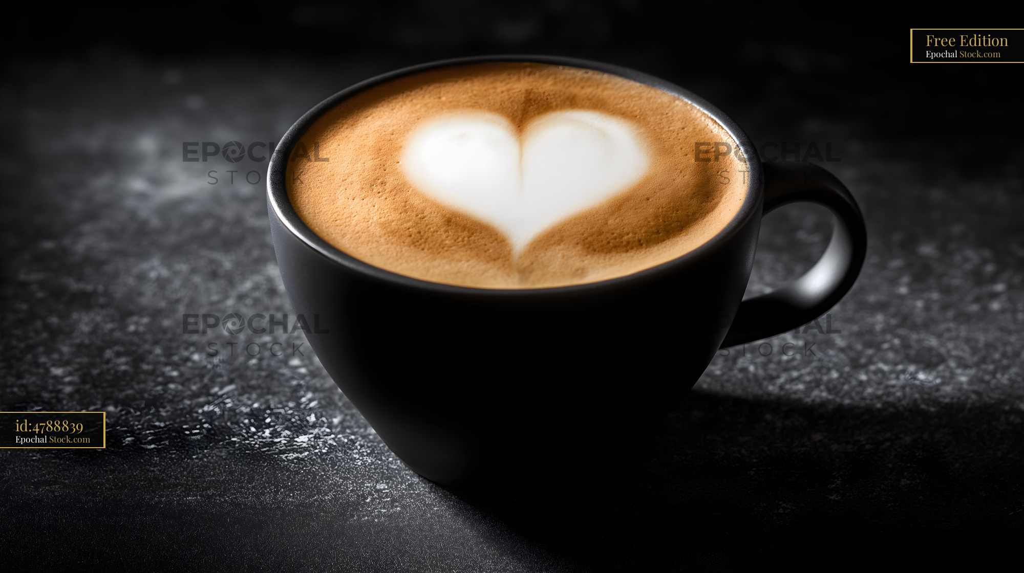 A black coffee cup sits on a dark surface. The drink inside has a heart design made from milk foam. The lighting highlights the cup and the surface surrounding it.