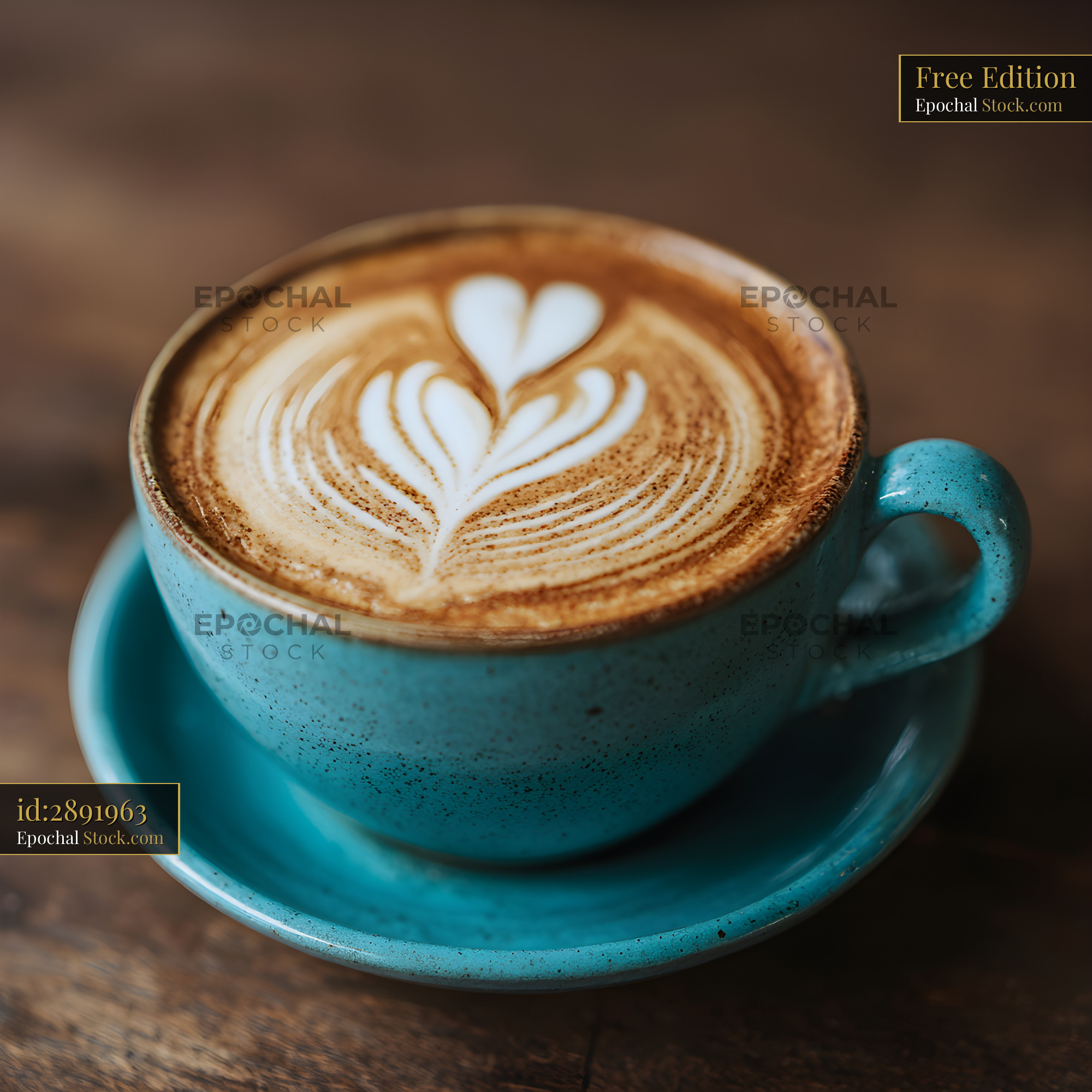 Coffee served in a blue cup with latte art on wooden table Free Premium Stock Photo