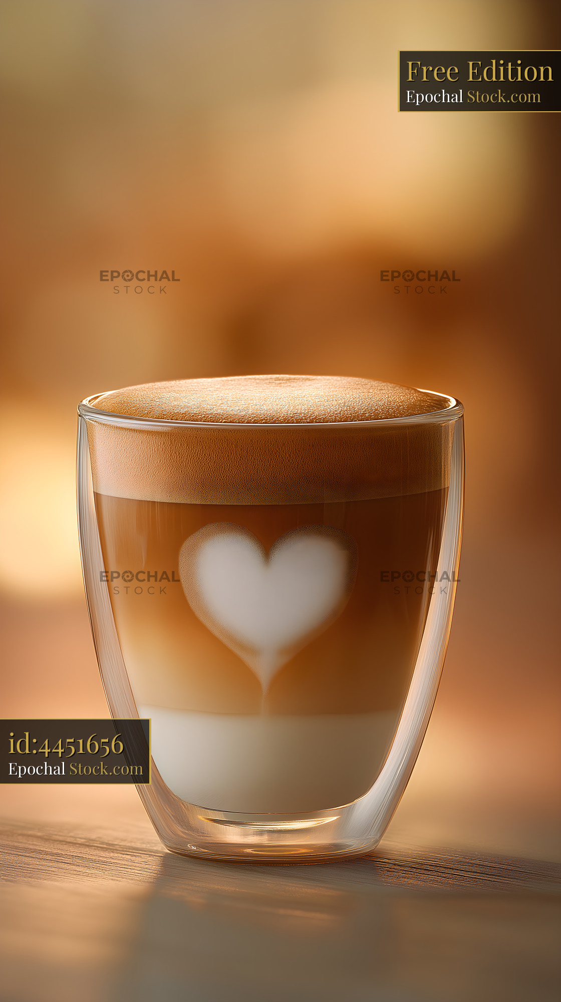 A glass cup holds coffee with foam shaped like a heart. The warm colors in the background create a cozy atmosphere. The setting suggests a cafe or home space in the morning or afternoon.
