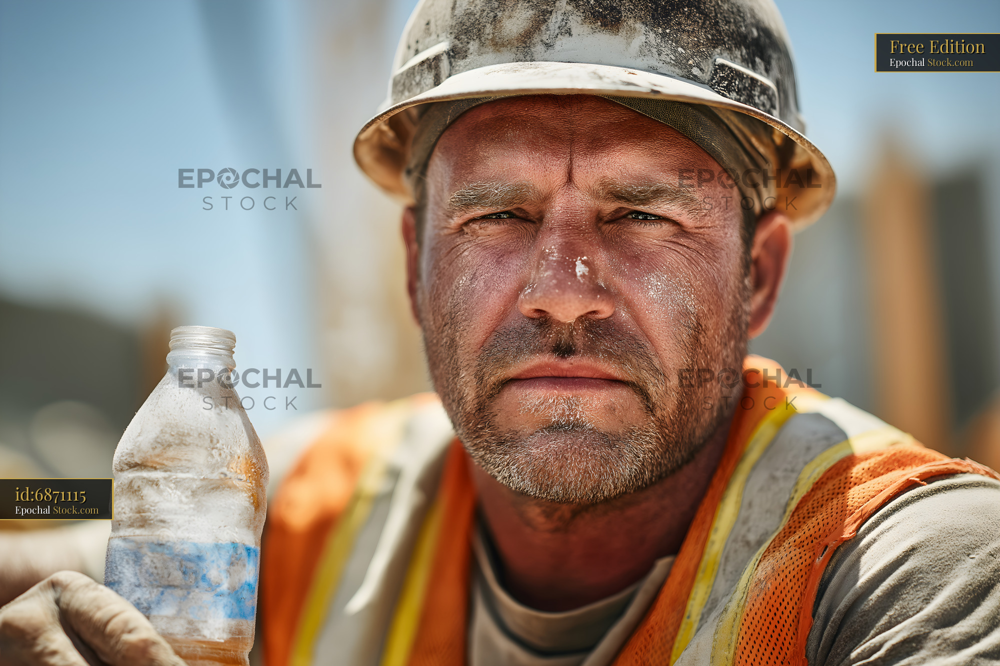 A construction worker sits on a job site, holding a water bottle. He has dirt on his face and is wearing a hard hat and safety vest. The sun shines brightly on him as he takes a moment to rest.