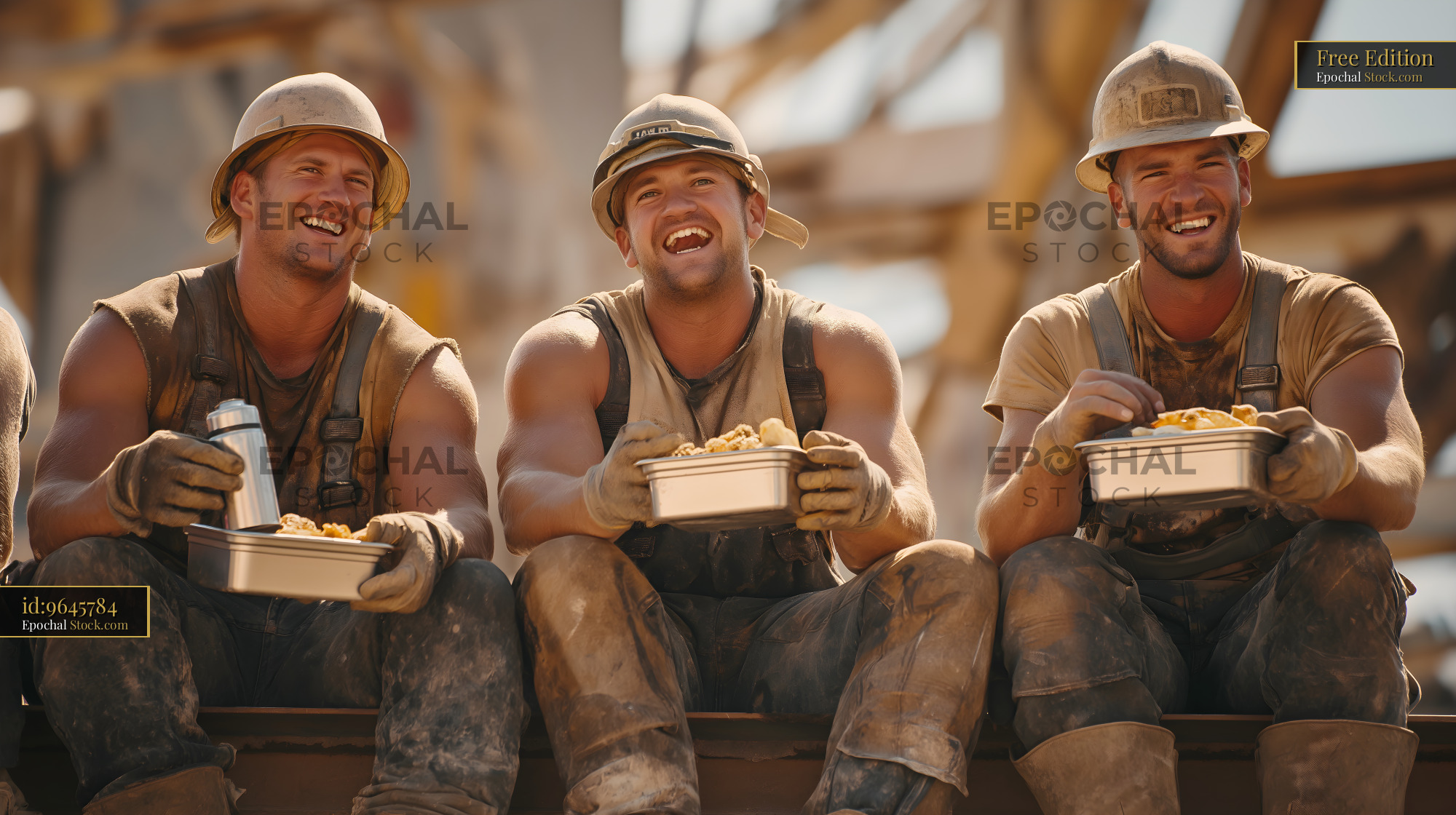 Construction workers enjoy lunch break in sunny outdoor setting Free Premium Stock Photo