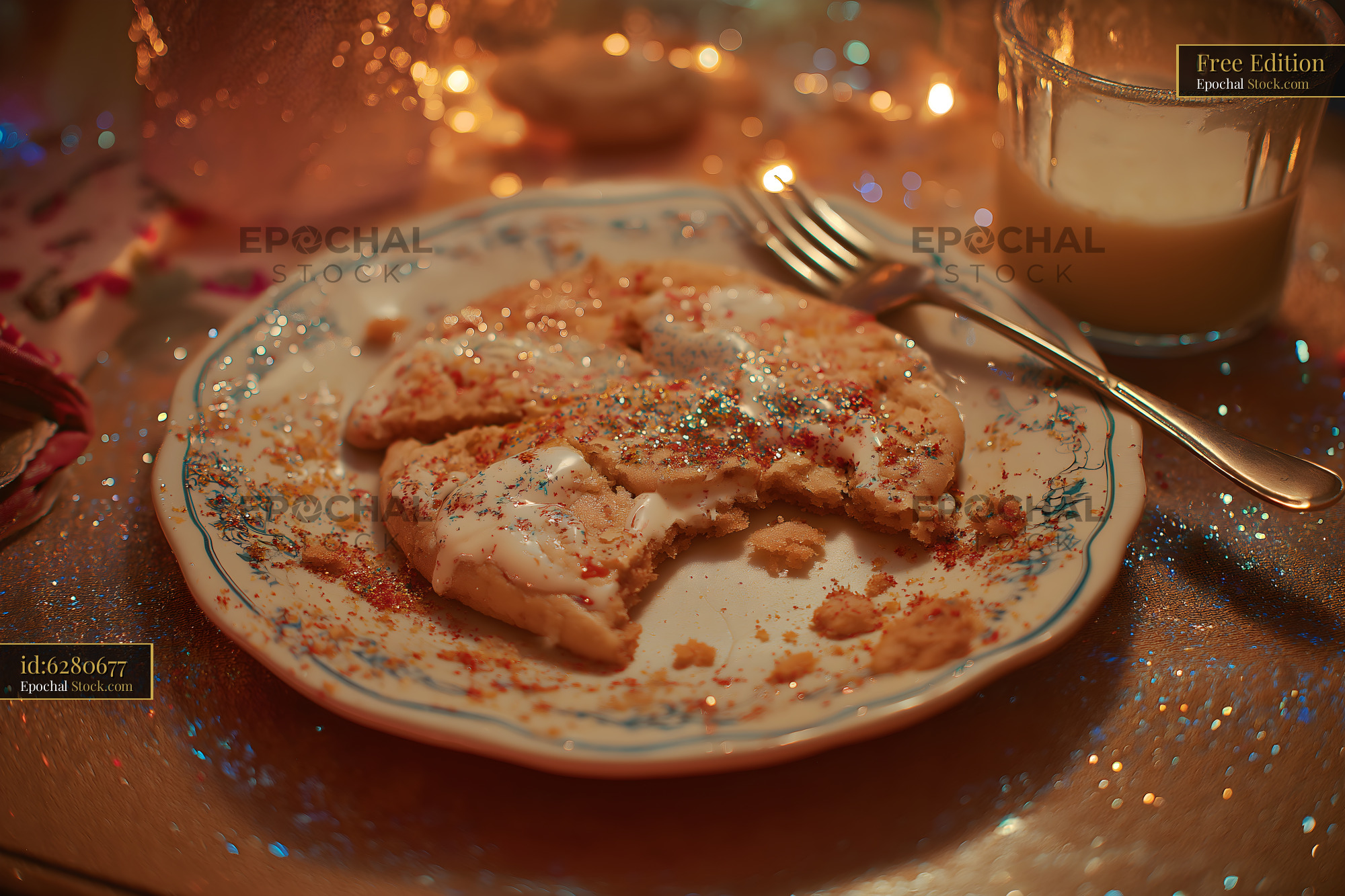 Cookies with frosting and sprinkles rest on a plate near a glass of milk. Soft lights shine in the background, creating a warm evening setting. The table is festive and colorful.