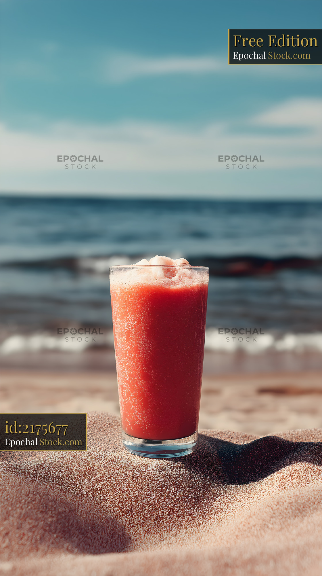 Cool drink sits on sandy beach by the ocean Free Premium Stock Image