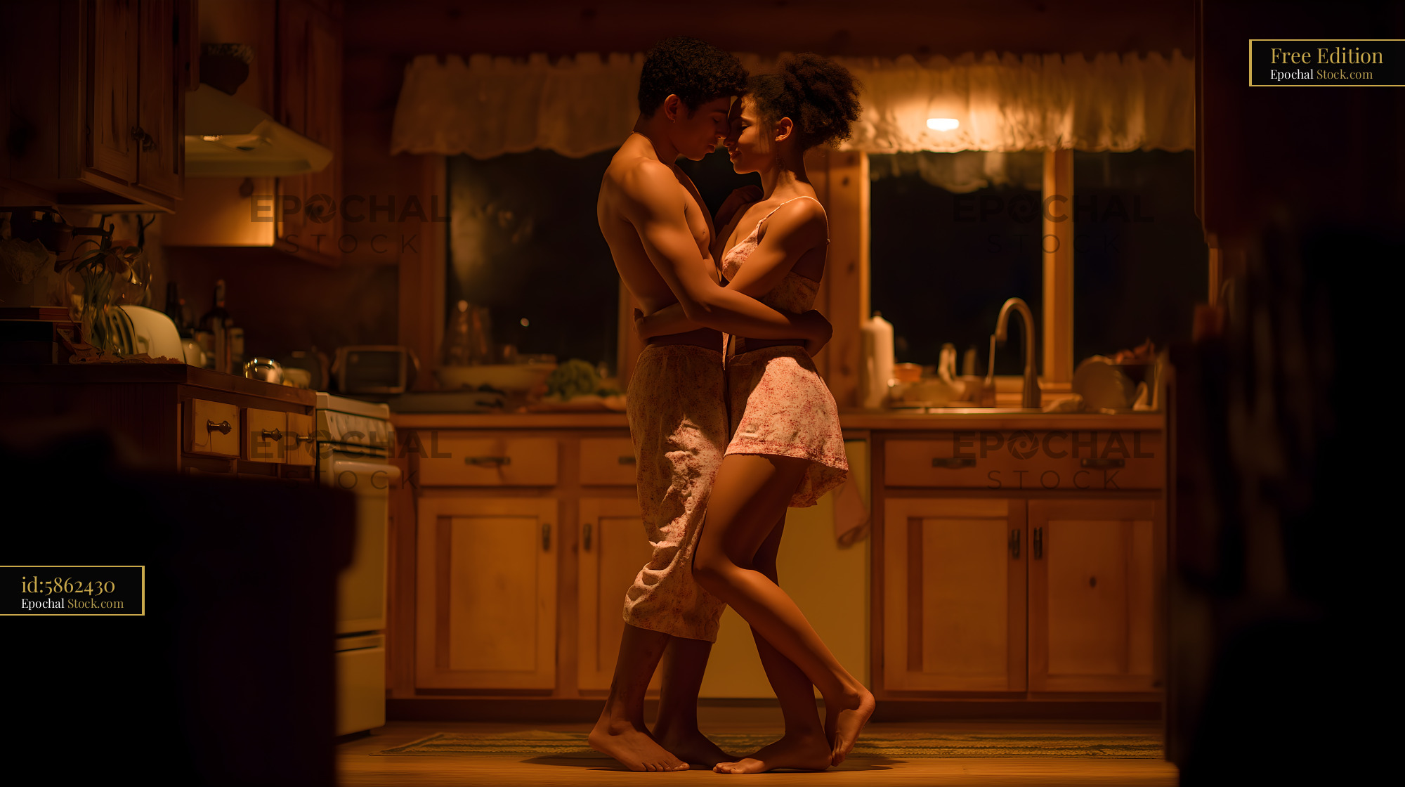 Couple dances in the kitchen of a cozy home at night Free Premium Stock Image