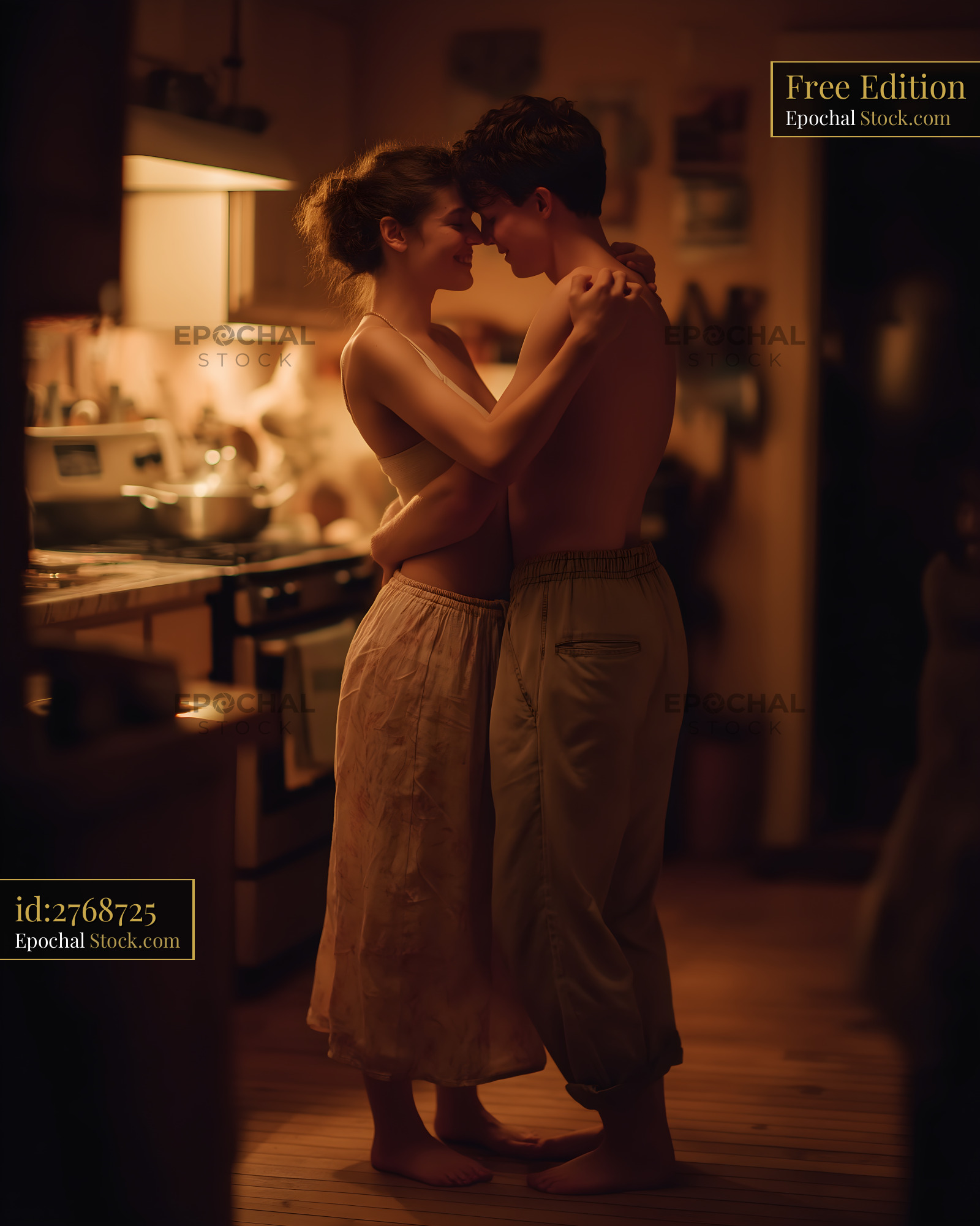 A couple stands in a small kitchen, holding each other closely. The warm light from the stove fills the space as they share a moment together. This scene takes place at night.