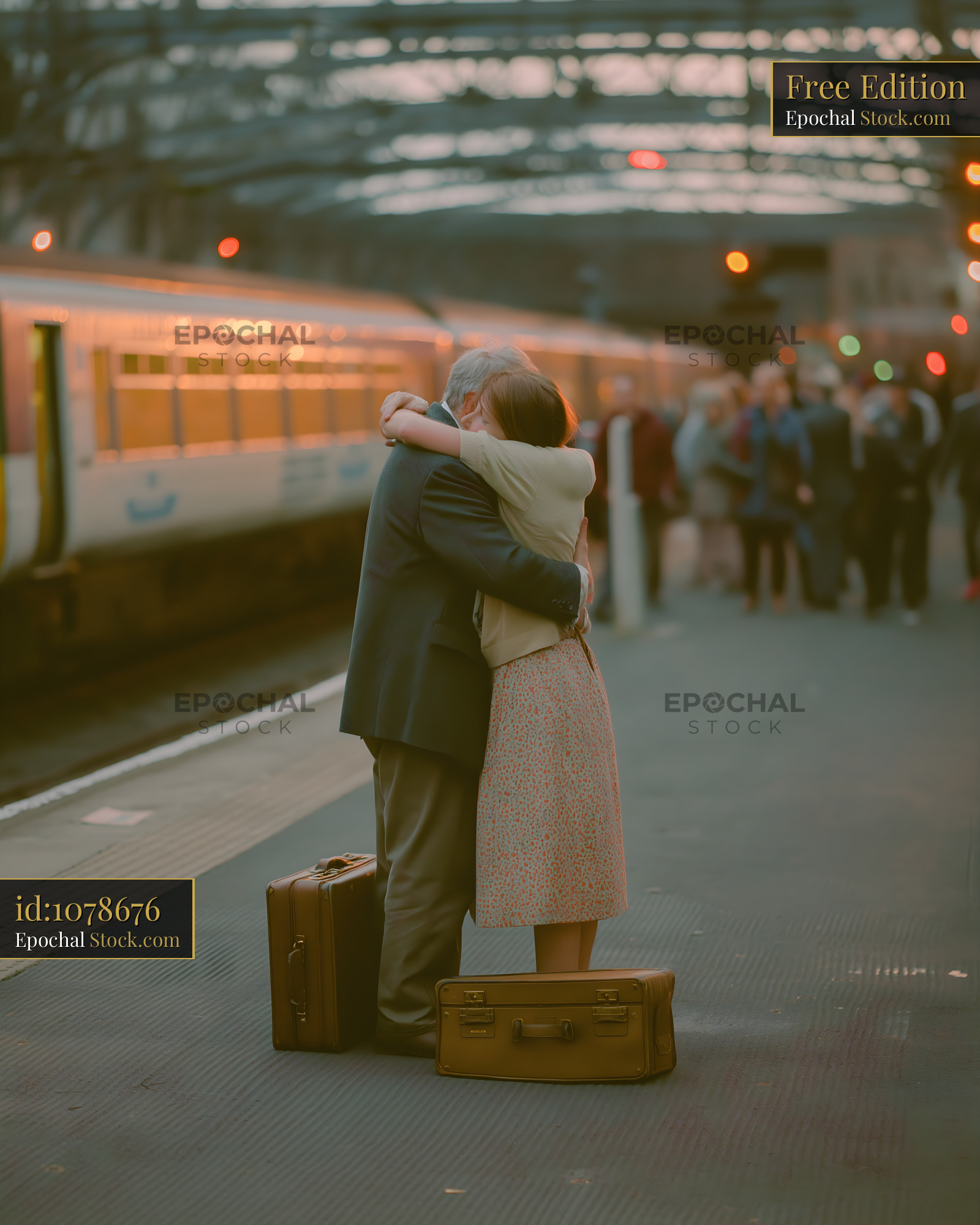 A couple stands at a train station, hugging tightly. They are surrounded by people and luggage. The background shows trains and soft evening light. It looks like a moment of reunion.