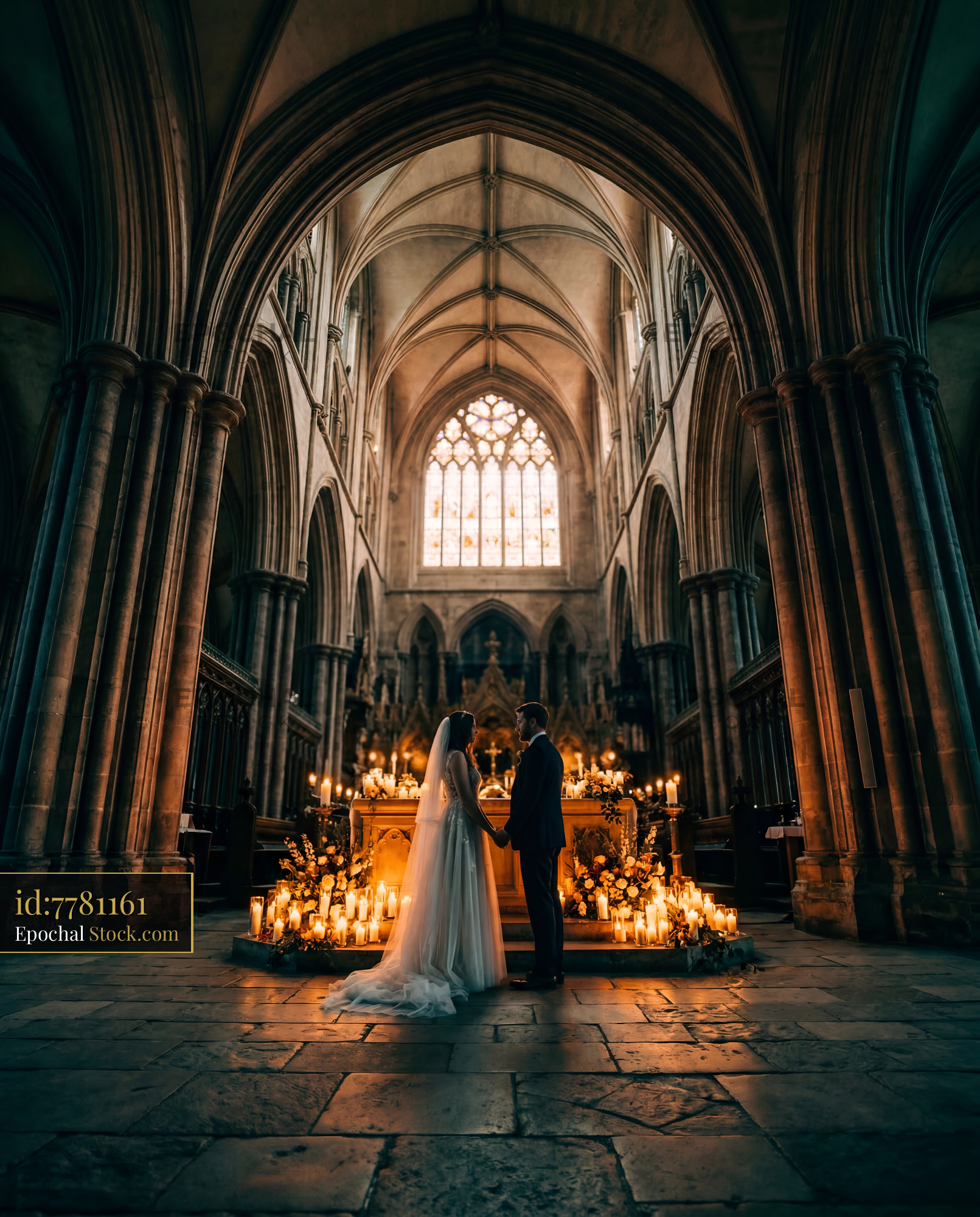 A couple stands facing each other inside a large church with high arches. They hold hands in front of an altar filled with candles. Light streams through the tall stained glass windows.