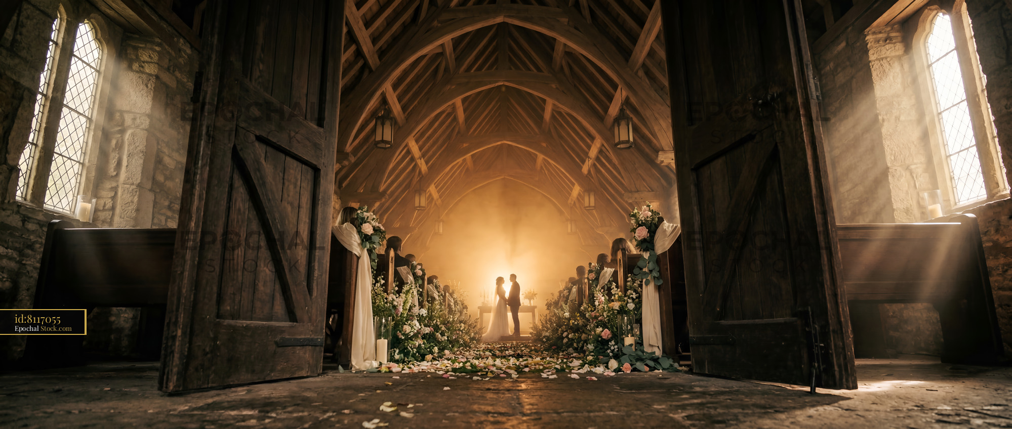 A couple stands together at the front of a church. Flowers line the aisle. Light shines through the doors. Guests watch as they share their vows. The atmosphere is filled with love.