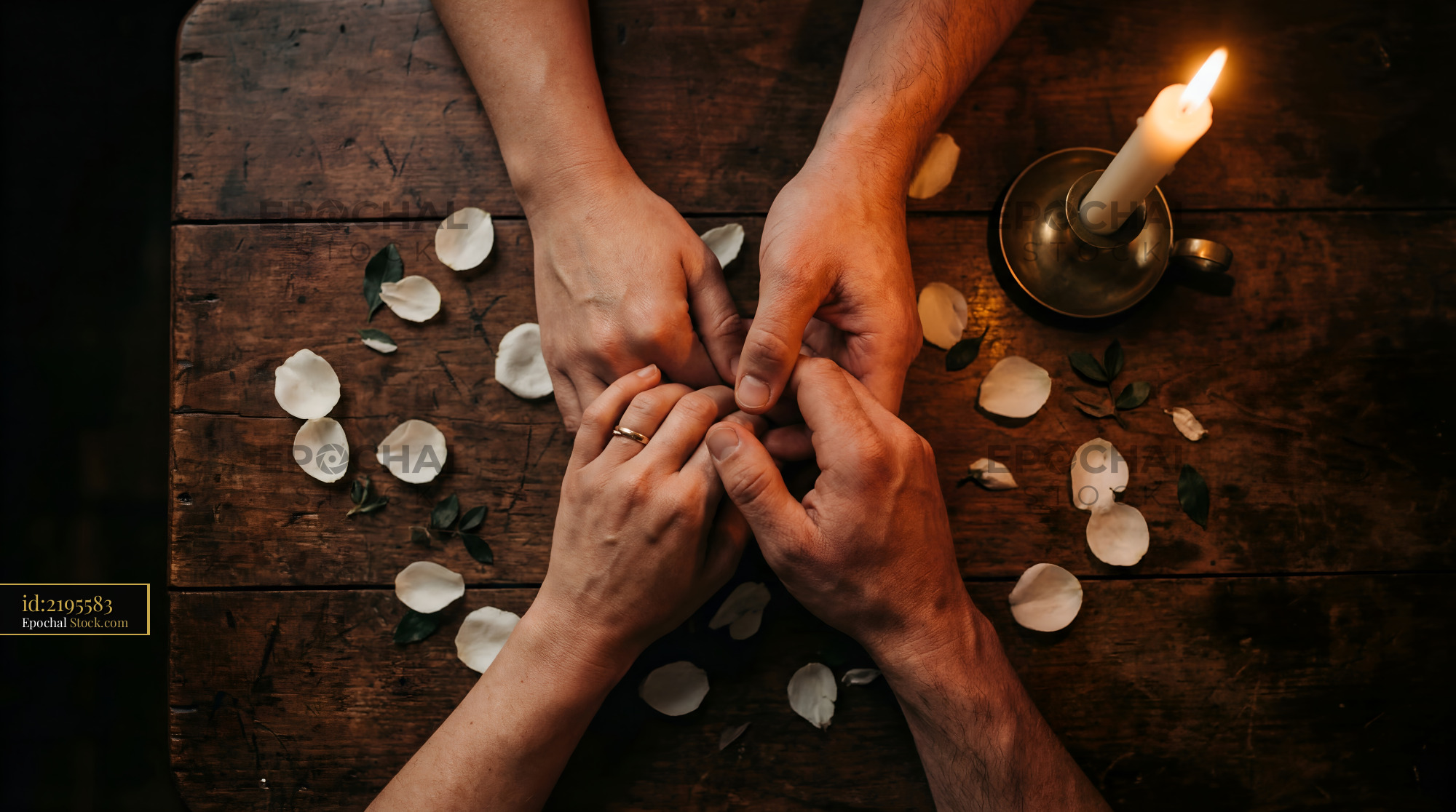Two hands are clasped together on a wooden table. Around them are rose petals and a lit candle. The scene shows a moment of connection and intimacy.