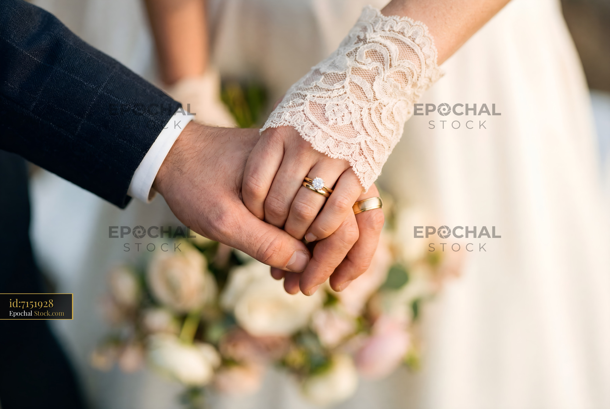 A couple holds hands while standing together. The bride wears a lace glove and the groom is in a suit. They have a bouquet of flowers nearby. It is a moment of connection during a wedding.