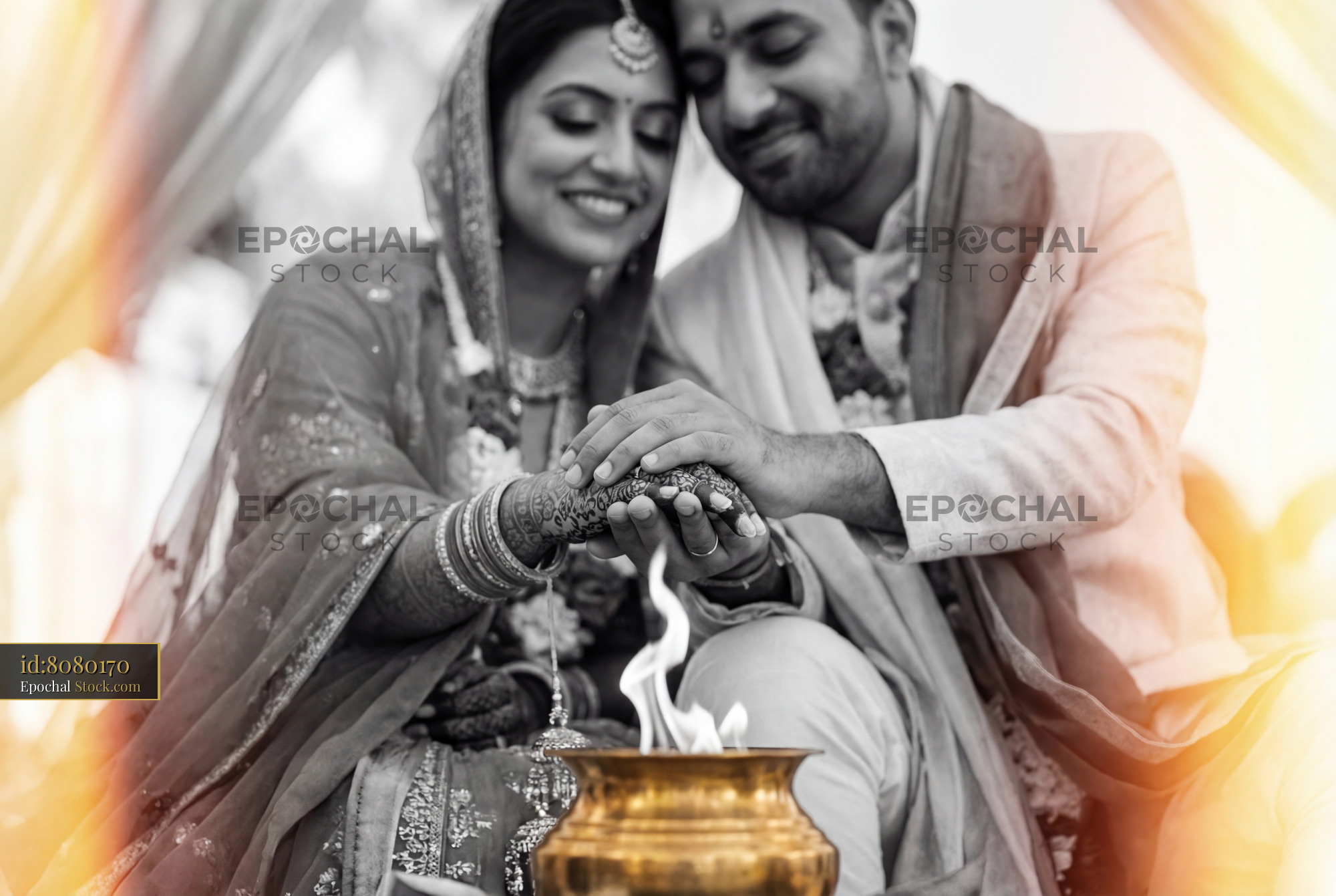 A couple sits close together, hands joined over a small fire. They are dressed in traditional clothes and are surrounded by colorful decorations. The moment is sacred as they share their vows.