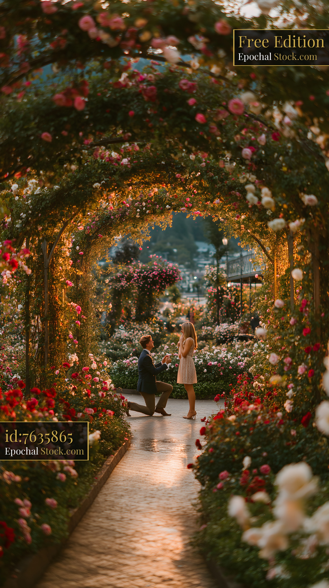 A man kneels to propose to a woman in a rose garden filled with colorful flowers. The sun sets in the background, creating a warm glow around them.