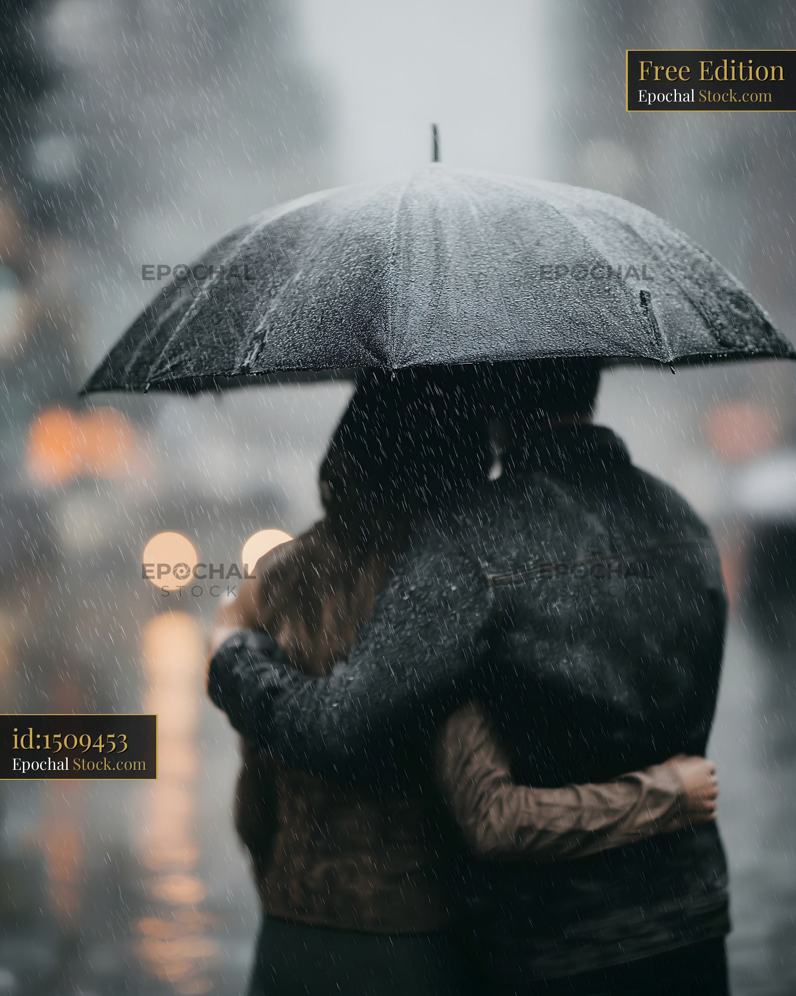 Two people stand close together under a black umbrella in the rain. They are in a busy city with blurred lights in the background. Water falls around them as they hold each other.