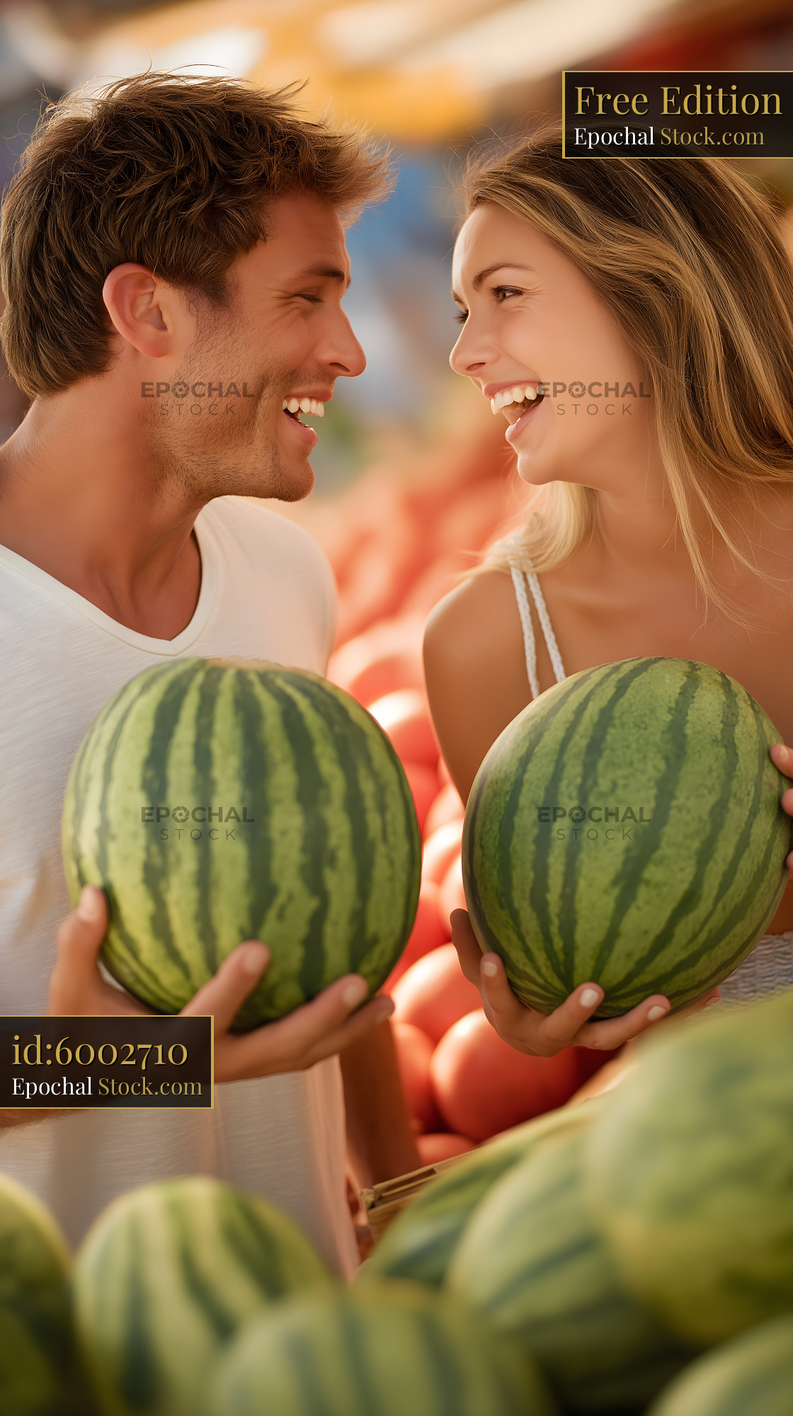 A couple stands at a fruit market holding watermelons. They smile and laugh while surrounded by various fruits. The sun shines above creating a warm atmosphere.