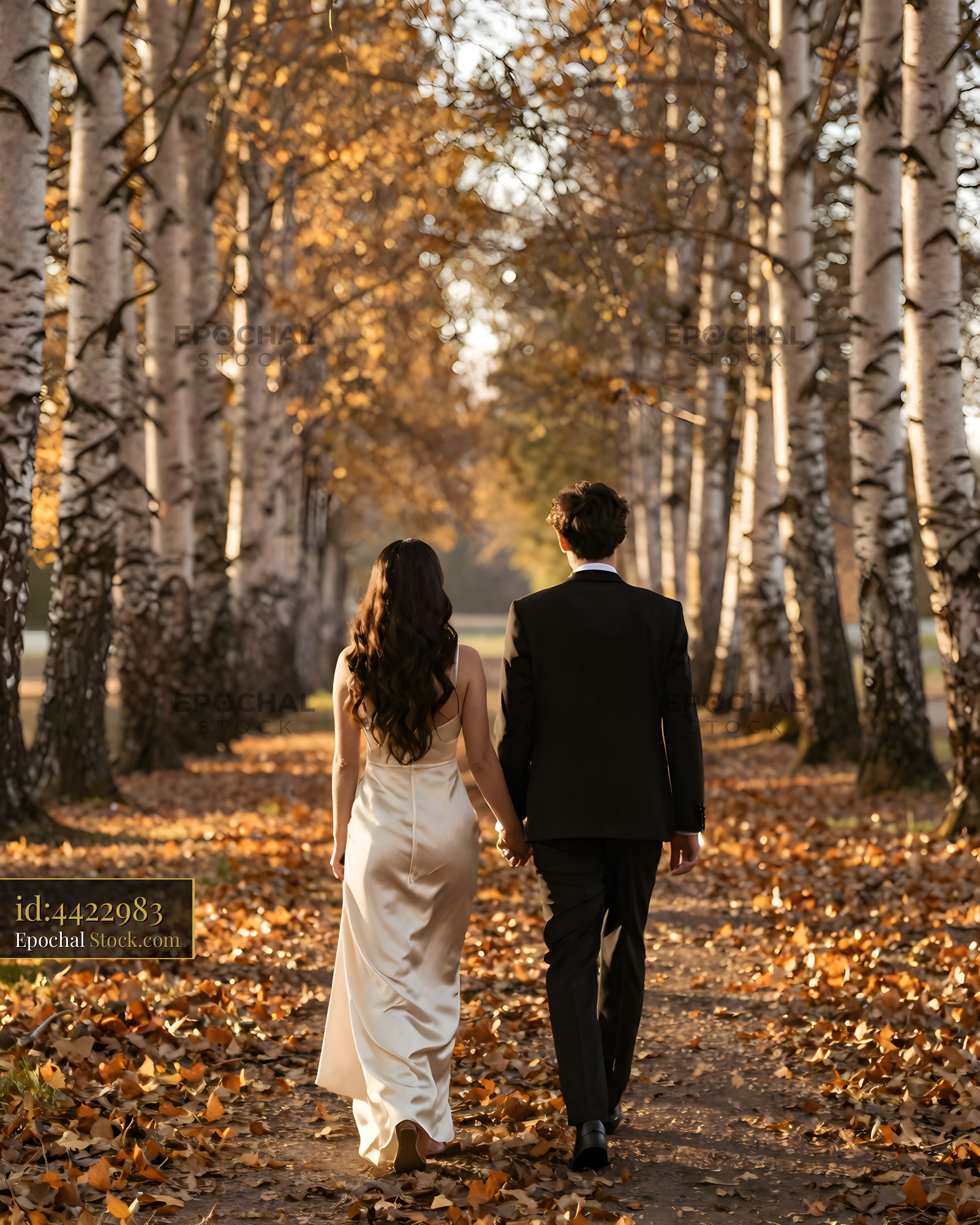 A couple walks together down a path lined with trees. Leaves are orange and yellow. The sun shines on them as they hold hands. They enjoy their time in nature during autumn.