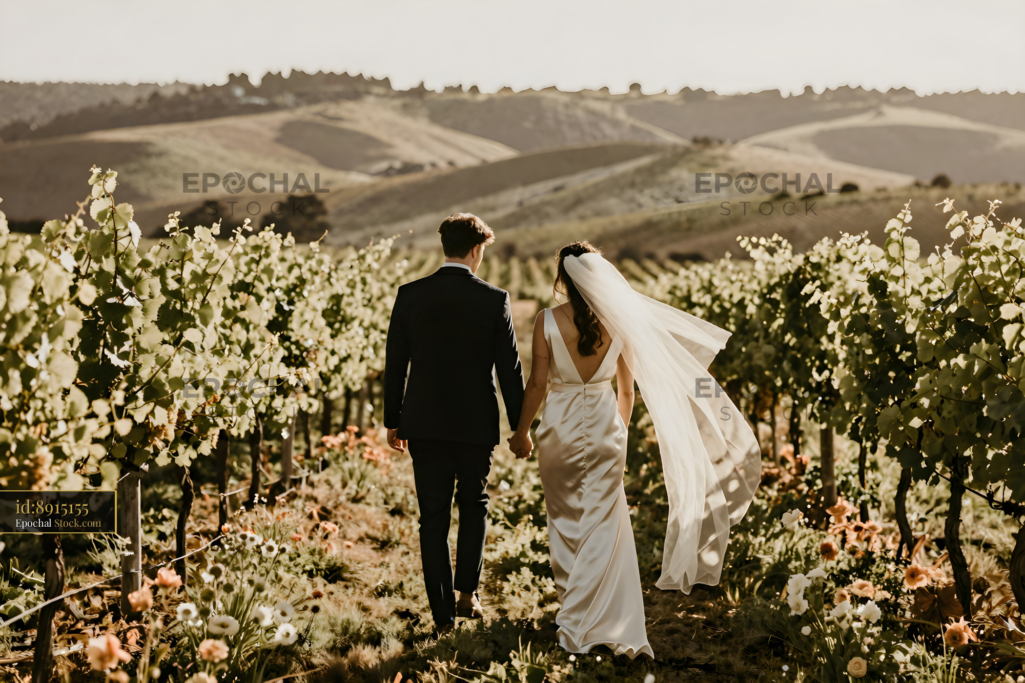 A couple holds hands while walking through a vineyard. They are dressed for their wedding. Sunlight shines on green vines and hills in the background. Flowers grow along the path.