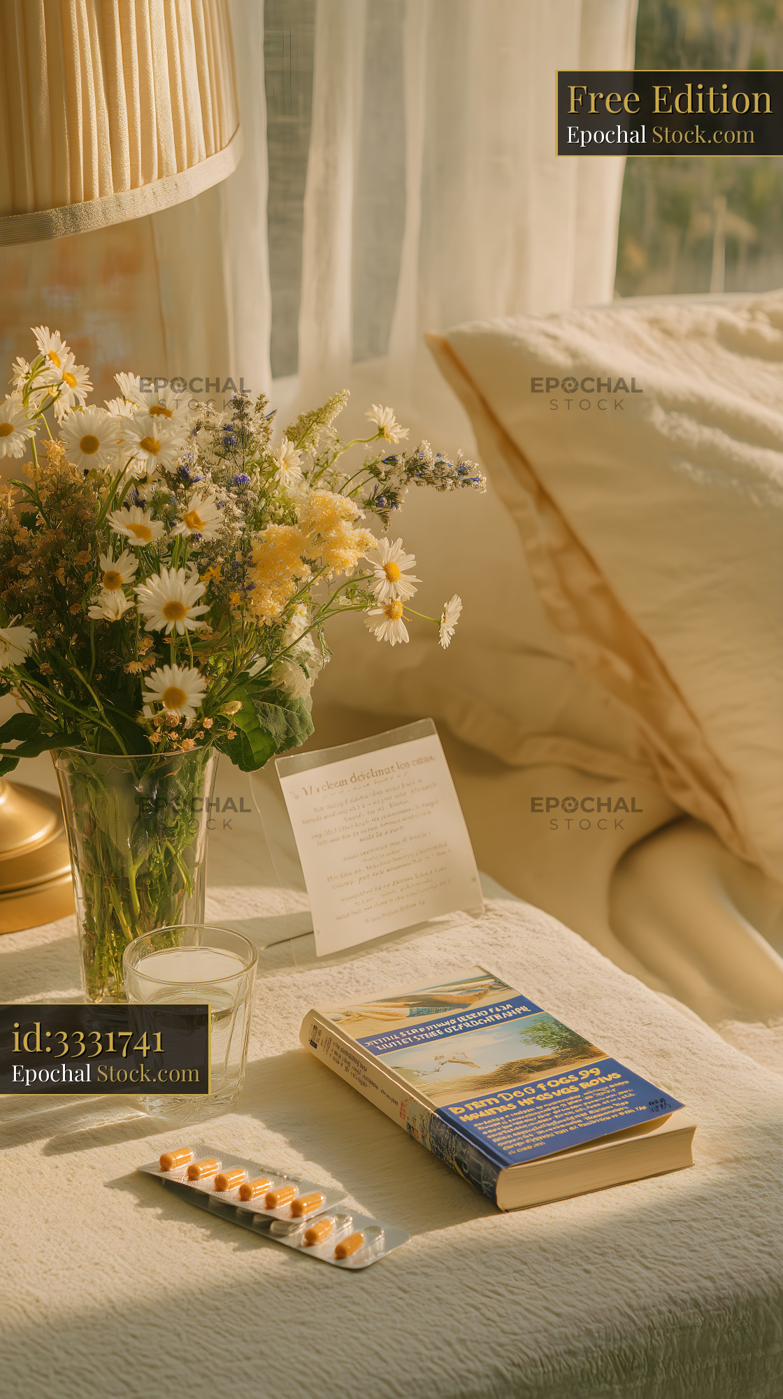 A table holds a glass of water, a book, and a line of pills. A vase filled with flowers sits next to the book. Soft light filters through the curtains at a sunny time of day.