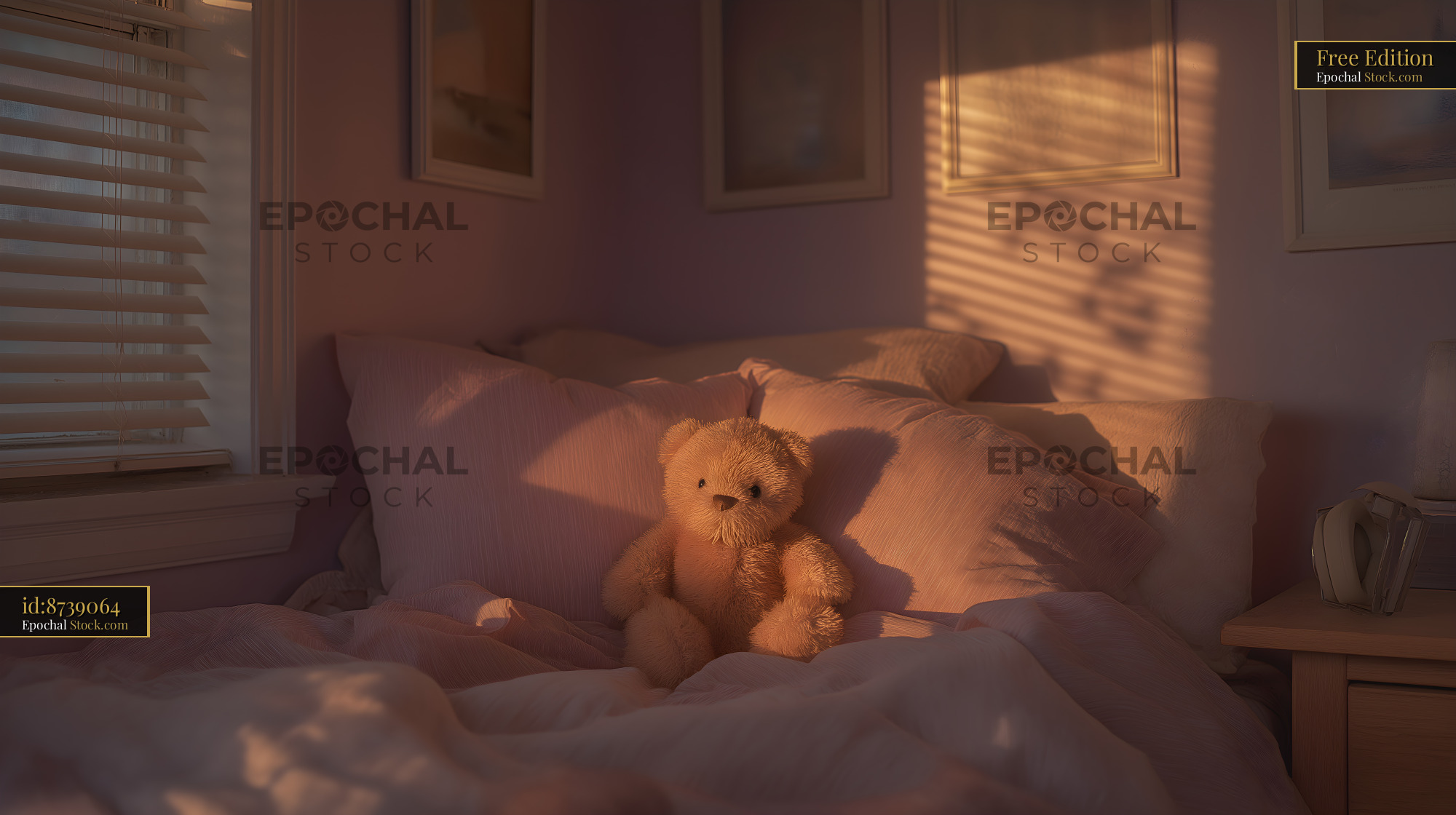 Cozy teddy bear sitting on bed in warm morning light Free Premium Stock Image