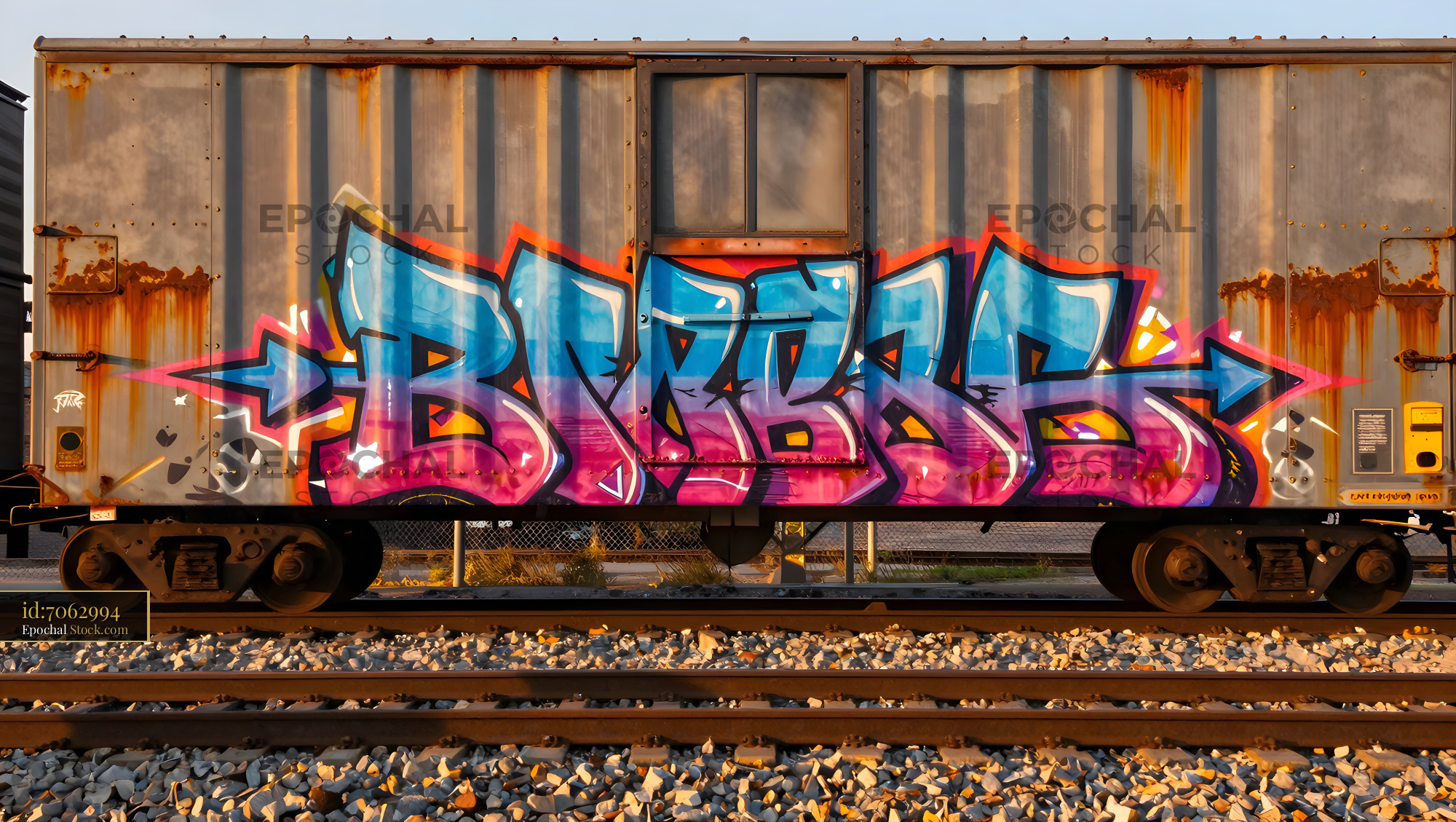 A train car stands on tracks with bright graffiti painted on its side. The artwork has different colors and shapes. The sun shines on the graffiti, showing its details clearly.