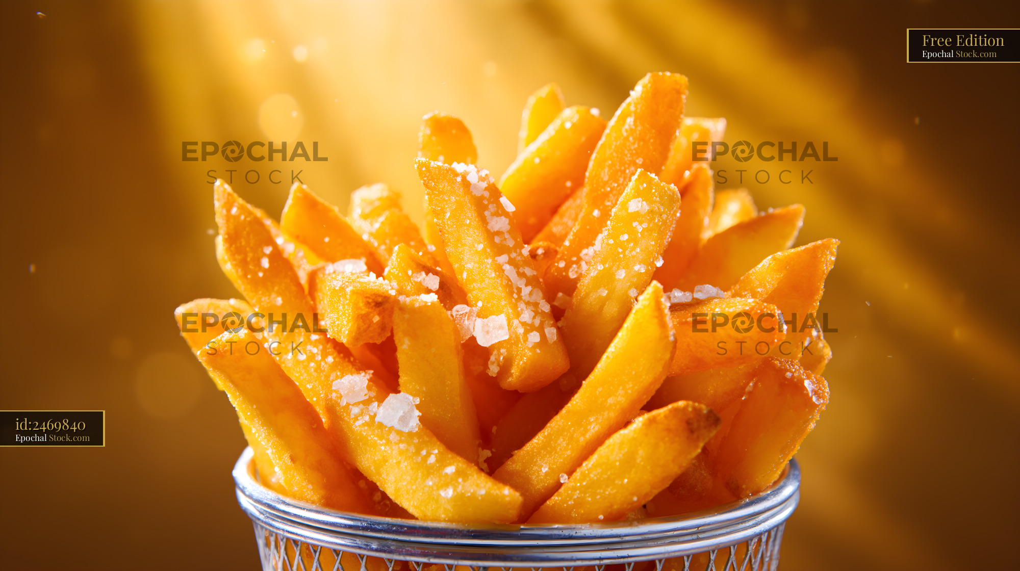 Crispy golden fries in a metal basket with salt on top Free Premium Stock Image