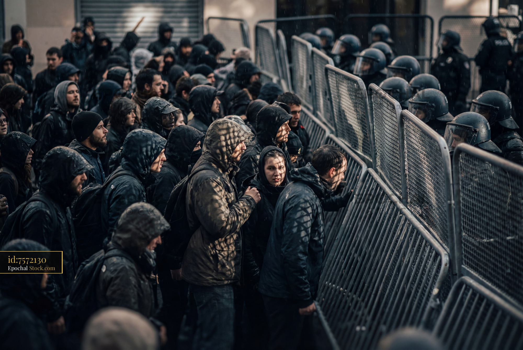 People stand in front of a police barrier during a protest in an urban area. Many in the crowd wear dark jackets and seem tense. The atmosphere is serious and charged.