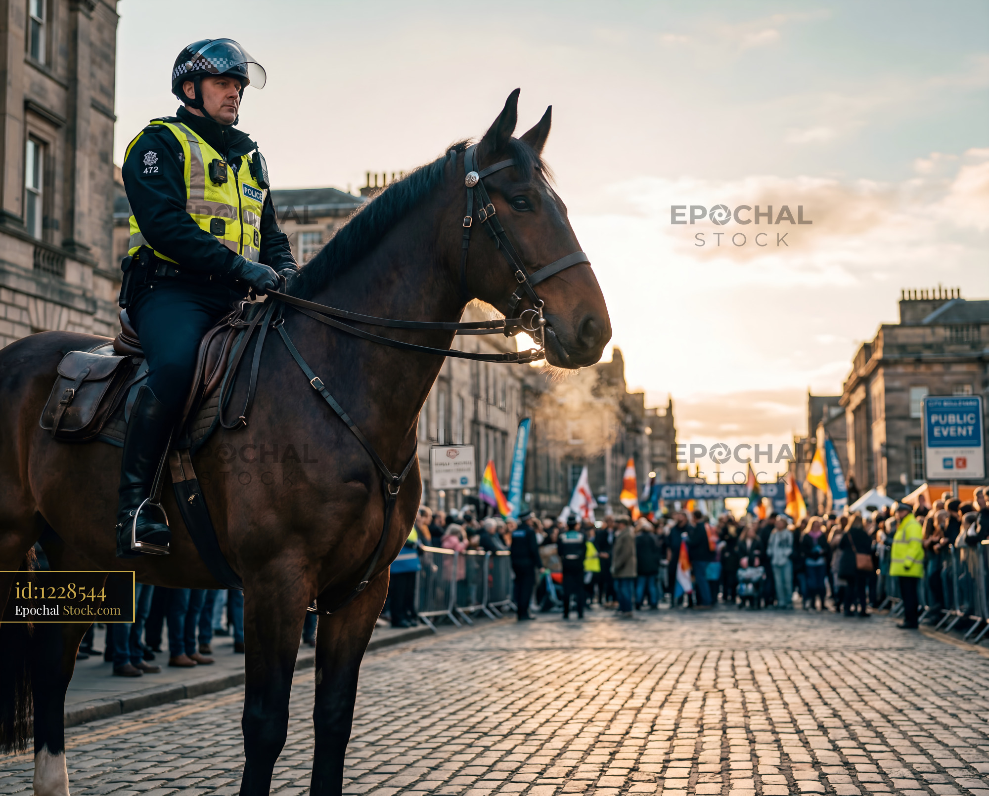 Crowd gathers for event while police monitor from horseback Premium Stock Photo