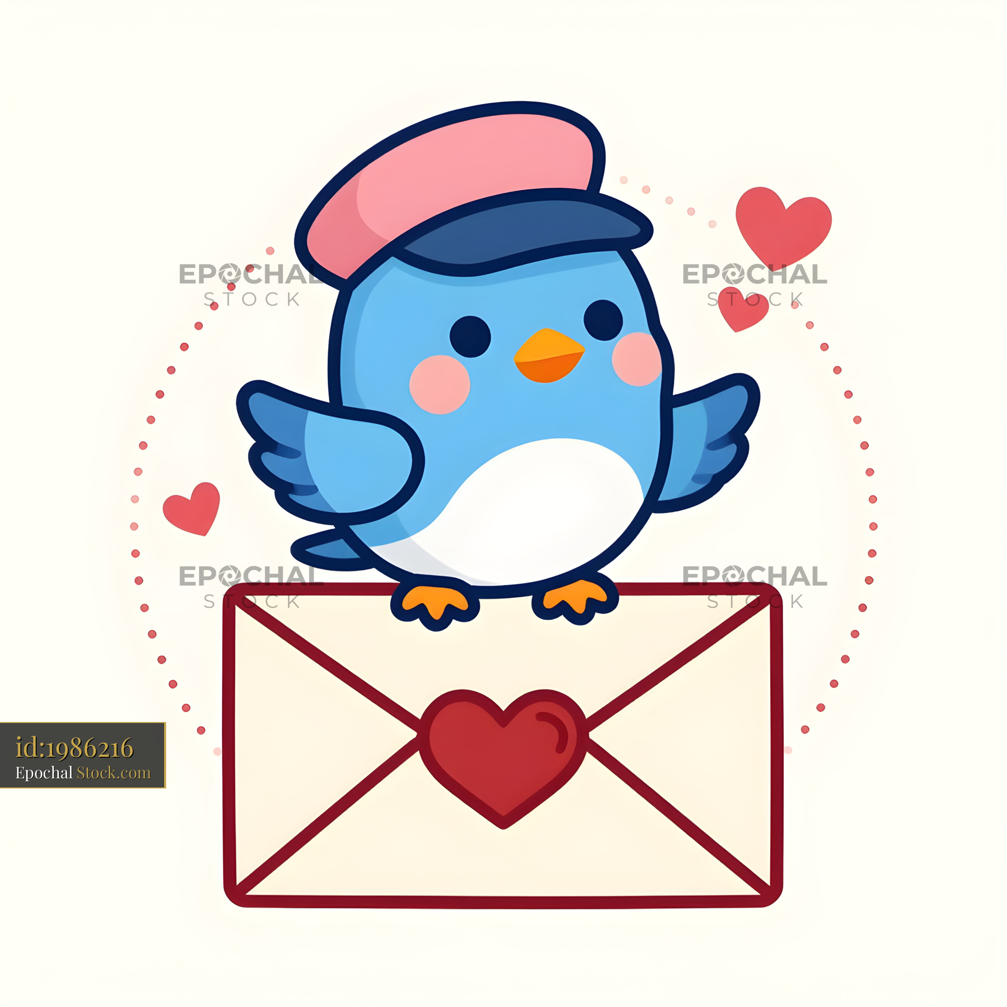 A blue bird with a cap stands on an envelope that has a heart. The bird looks cheerful and there are pink hearts in the background. This scene shows a theme of love and friendship.