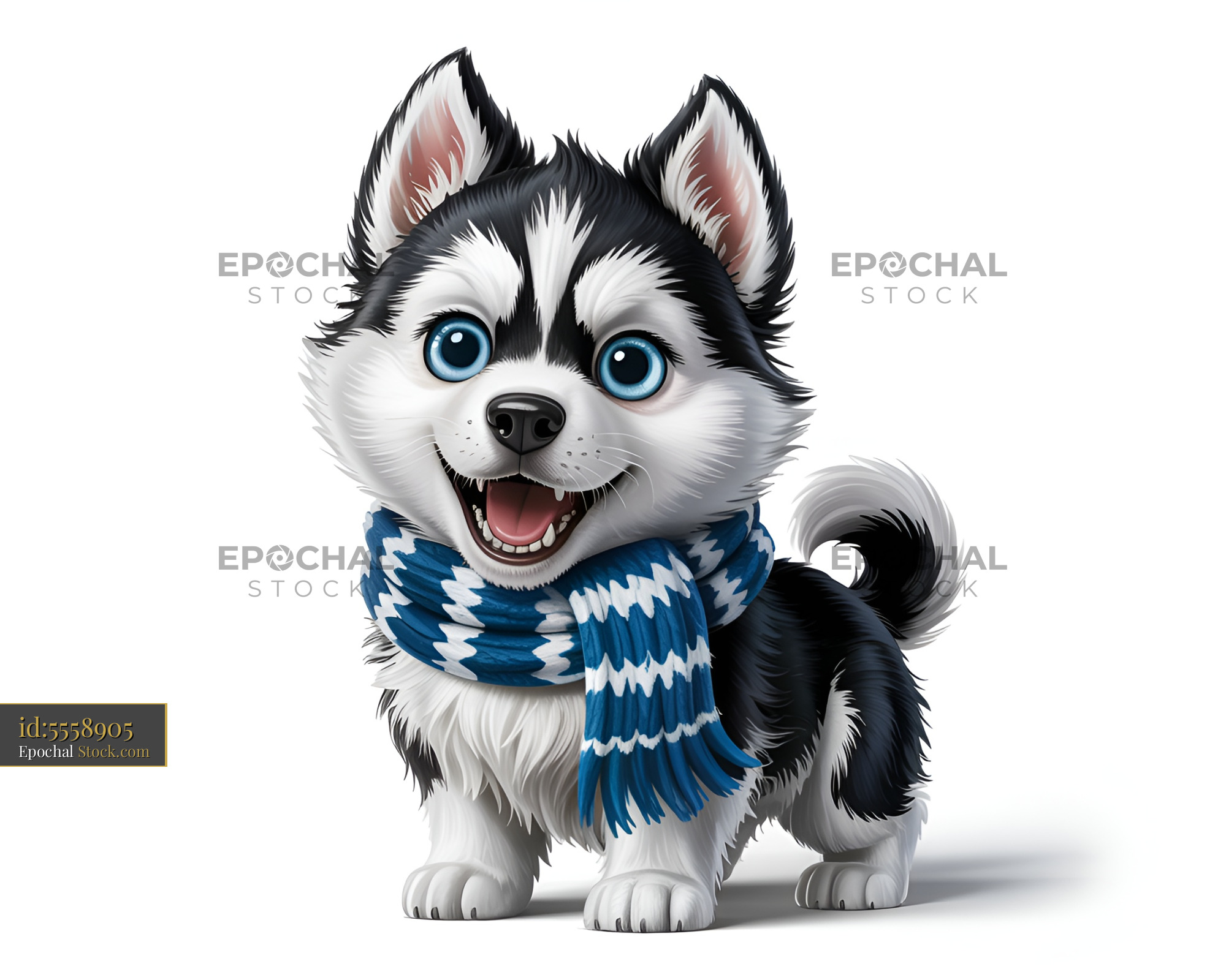 A small puppy stands on a white surface. It has black and white fur, bright blue eyes, and wears a blue scarf. The dog looks happy and playful, bringing joy and warmth.