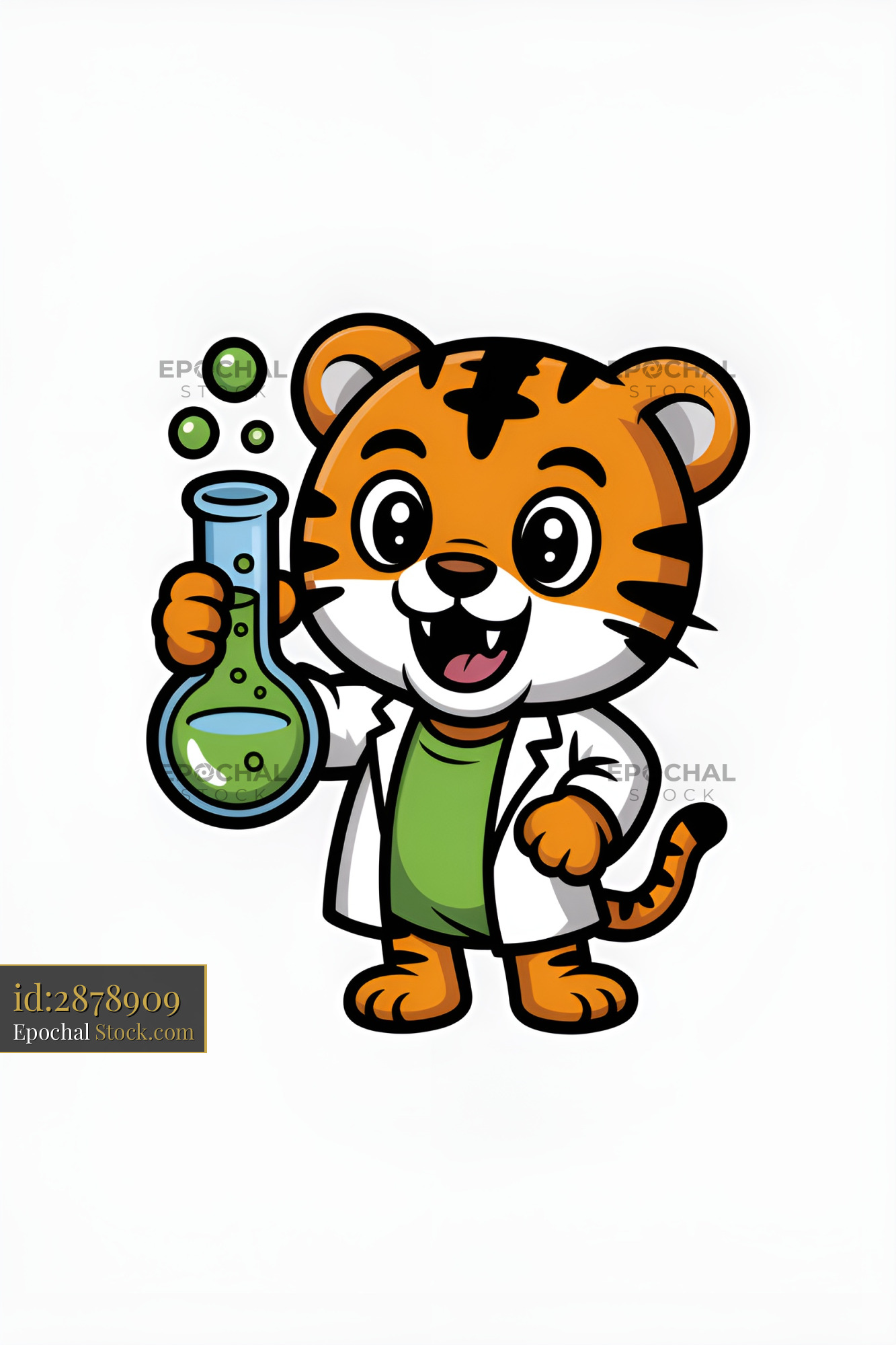 A tiger character wearing a lab coat smiles while holding a flask filled with green liquid. The setting appears to be a science lab. The scene is bright and playful.