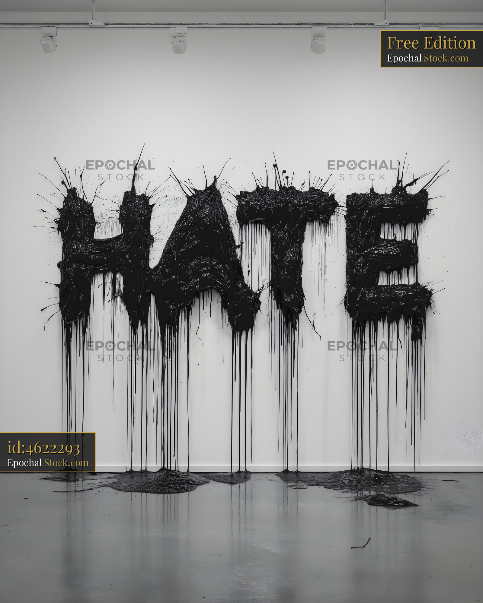 A large black art piece displays the word HATE on a white wall. The letters are formed with dripping paint, creating an intense visual effect in the gallery setting.
