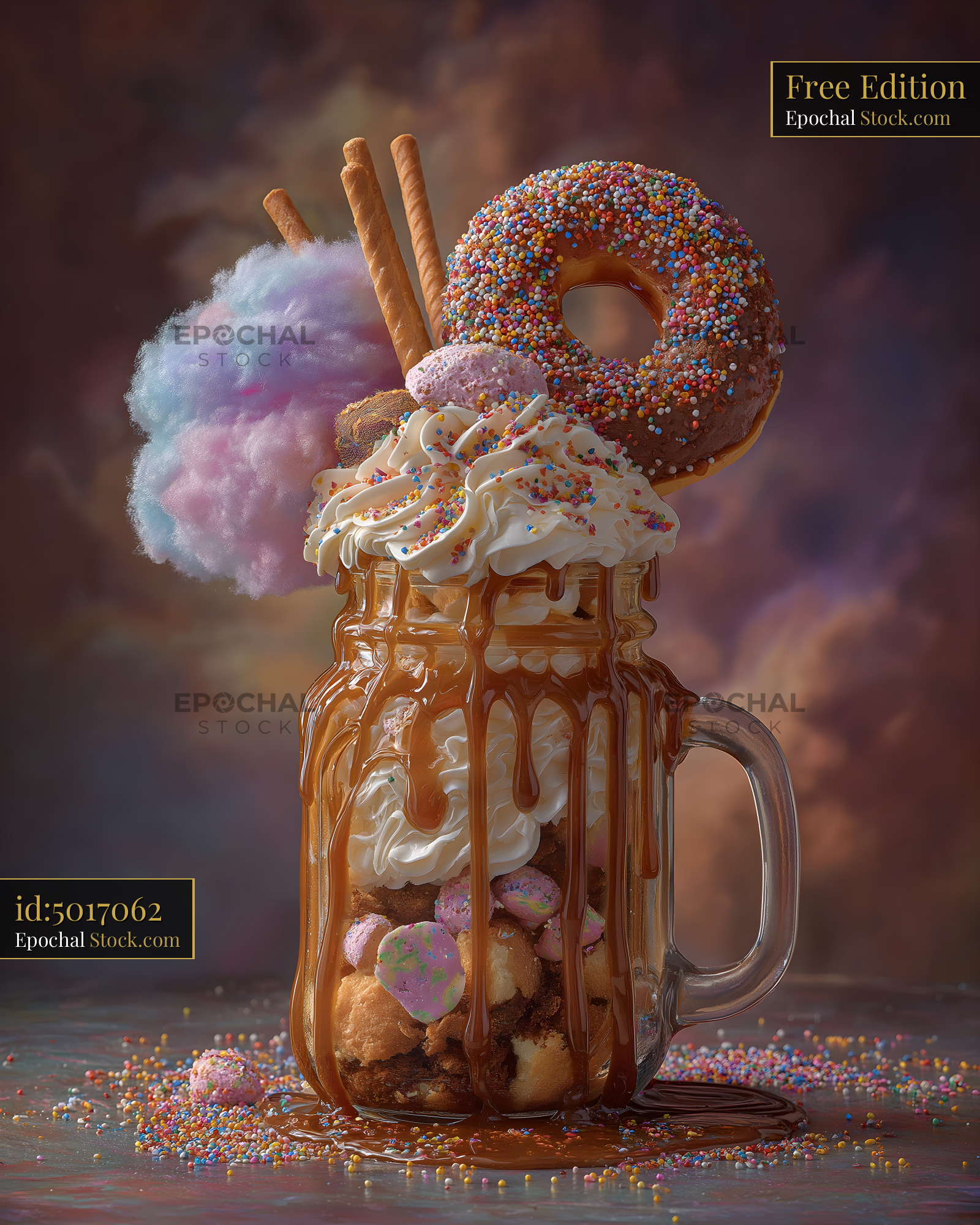 A tall glass holds a mix of dessert toppings. It features whipped cream, caramel sauce, a donut, cotton candy, and sprinkles. The background has a warm color blend and festive feel.