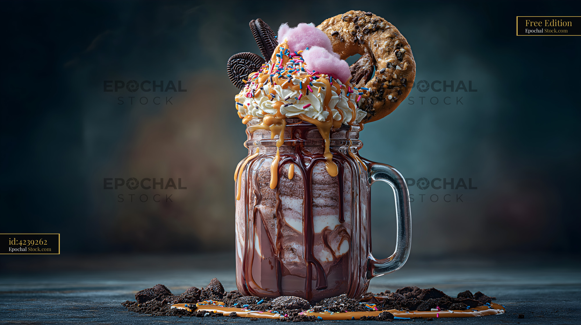A large jar holds a dessert drink topped with whipped cream, chocolate sauce, and various sweets. The scene is set on a dark background with scattered treats around the jar.