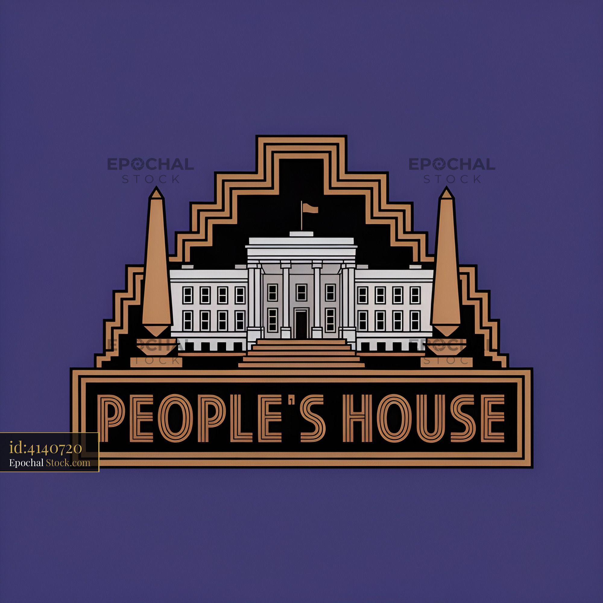 A graphic shows the front view of the People's House. The design includes steps leading to the entrance, two tall obelisks on either side, and a flag on top. The colors are bold and clear.