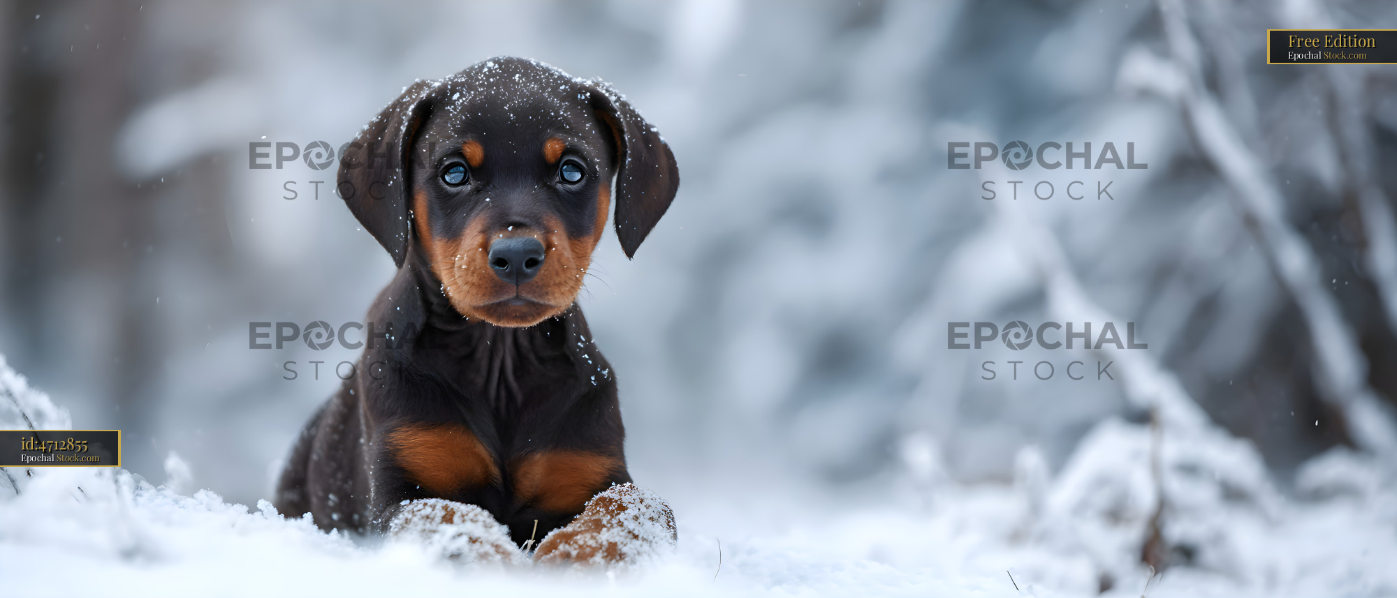 A young dog sits in the snow surrounded by trees. Snowflakes fall gently around as the puppy enjoys the cold winter day. The setting shows a quiet winter landscape.