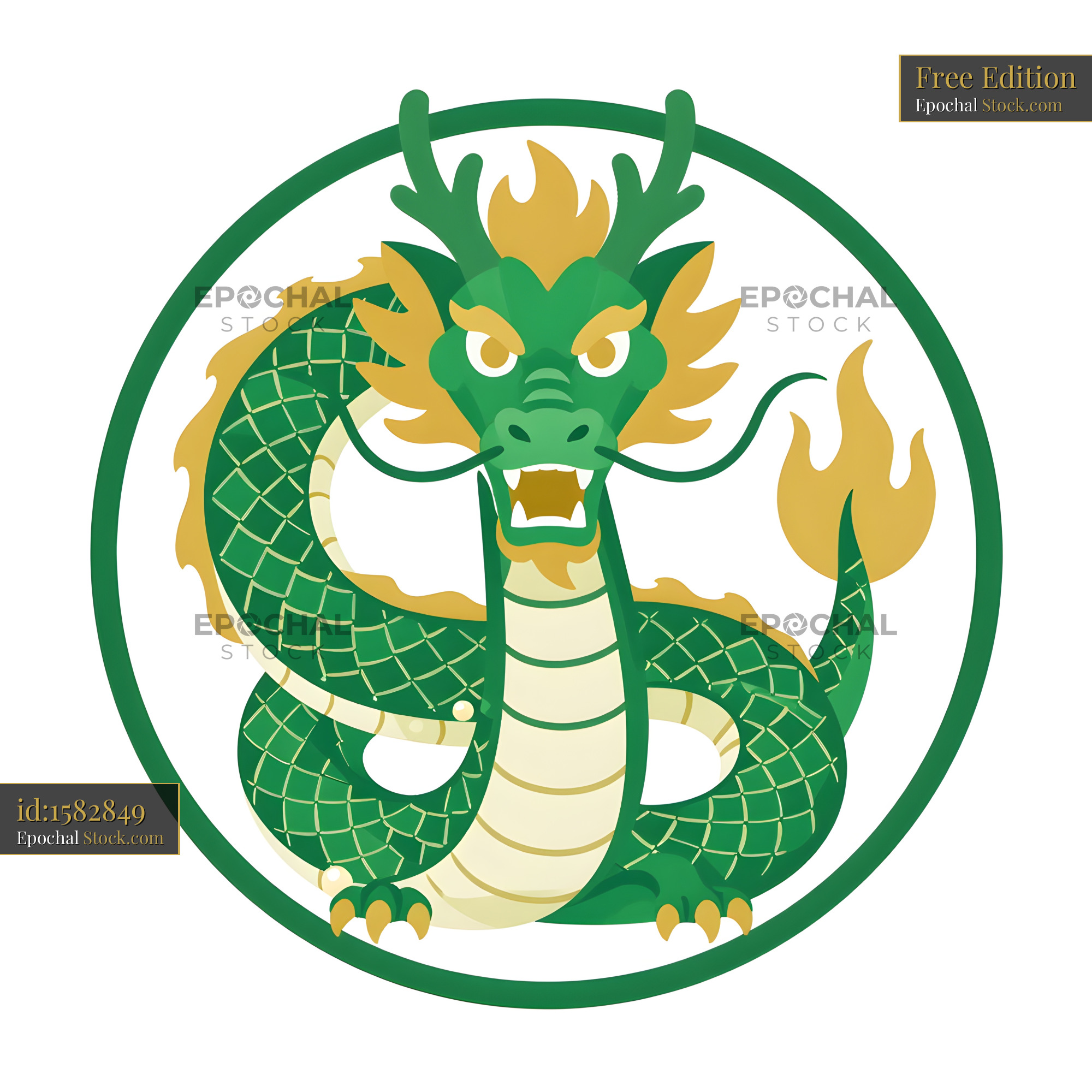 A dragon with green scales and a golden mane sits inside a circular shape. The dragon has sharp eyes and a fierce expression. Flames rise from the side of its mouth.