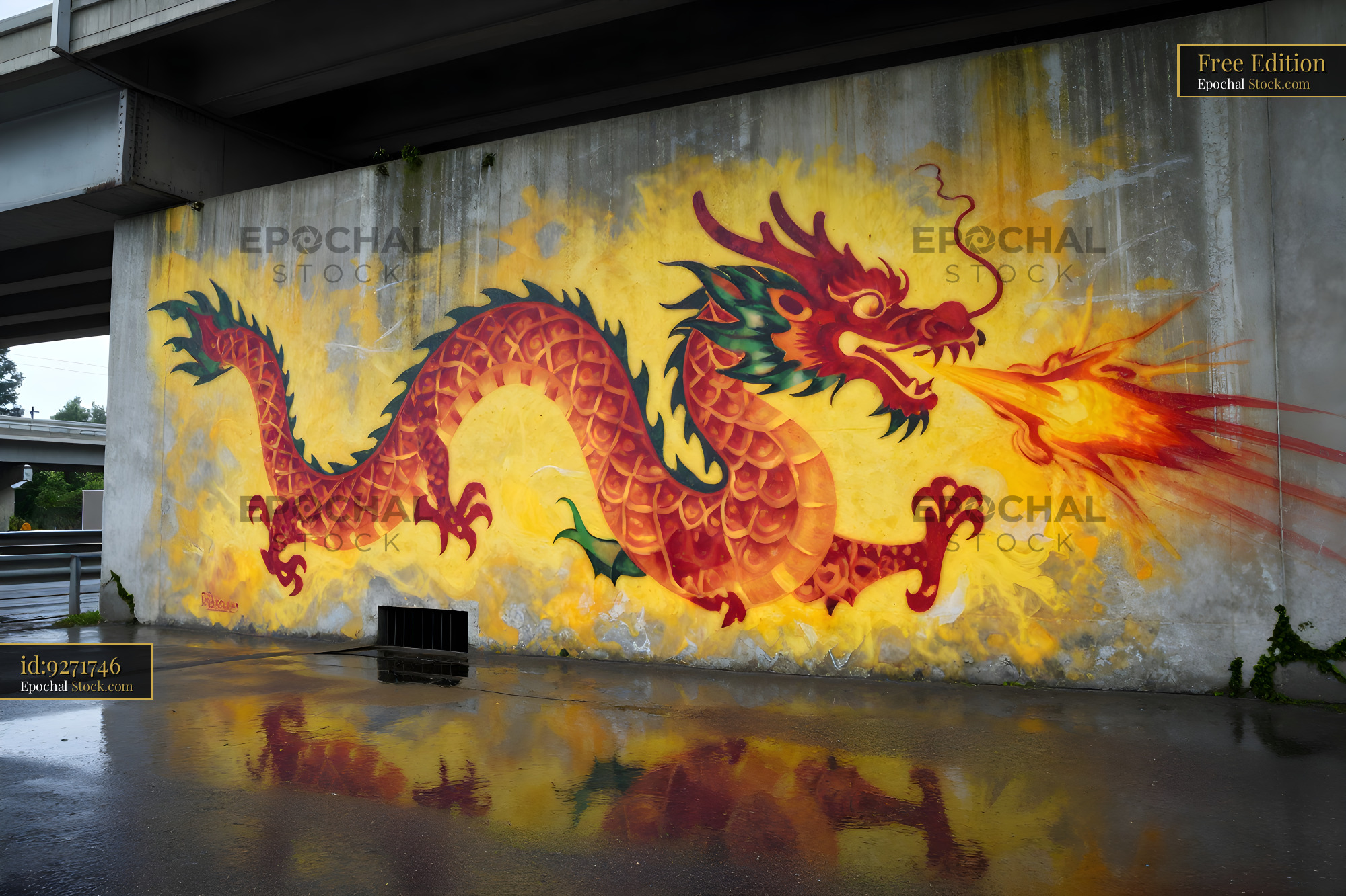 Dragon mural on a concrete wall beside a highway Free Premium Stock Image