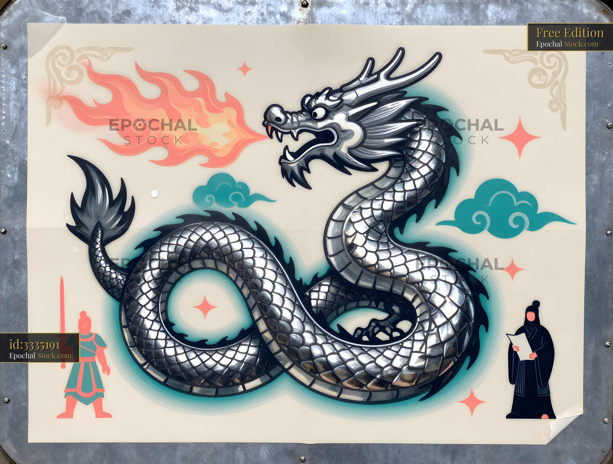 A silver dragon breathes fire among clouds on a wall. Two figures stand nearby, one with a sword and the other holding a scroll. The scene has bright colors and is located in a city area.