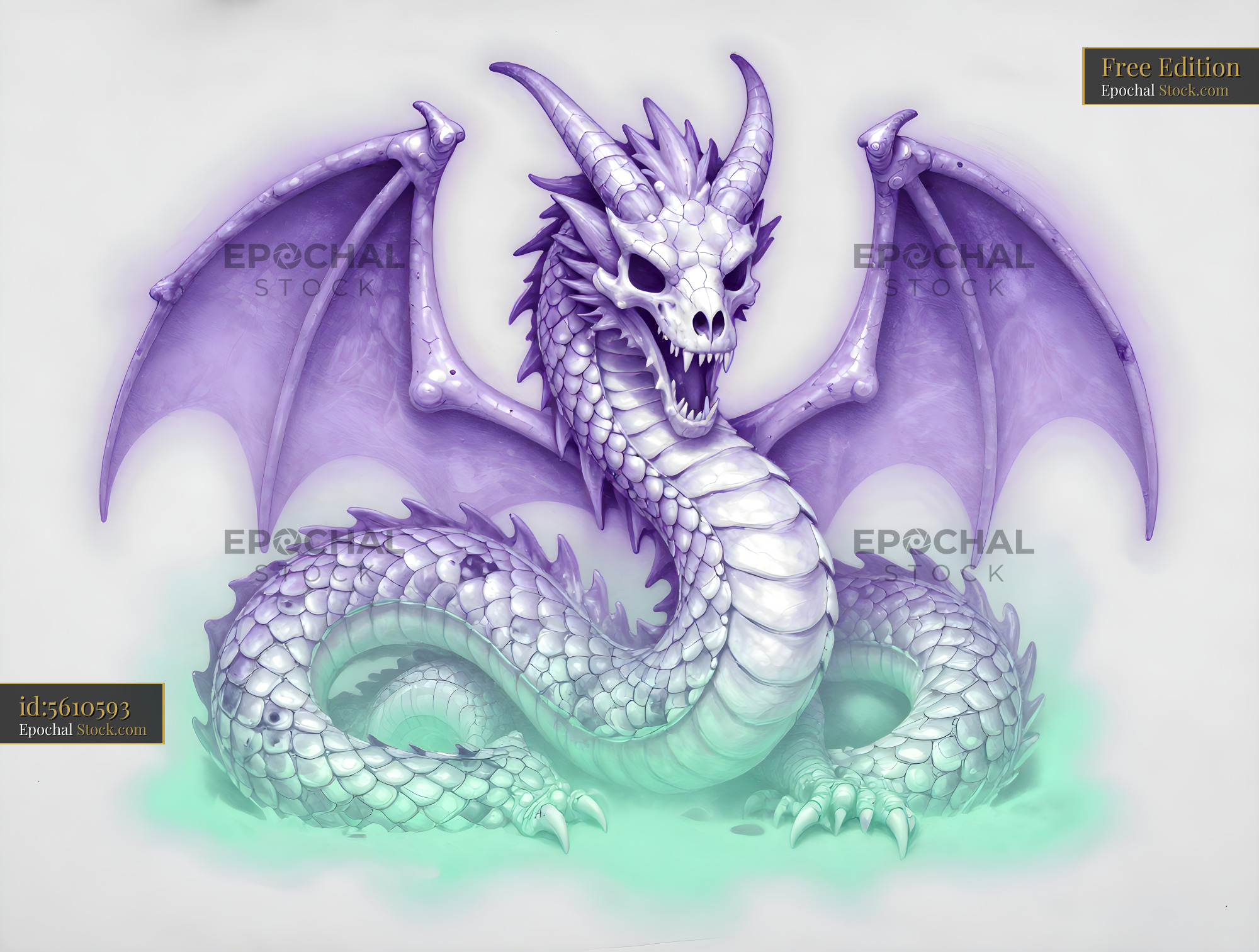 A dragon with purple wings sits coiled and ready to strike. Its scales are white and it has a fierce expression. Green mist surrounds its body, adding to its presence in the scene.