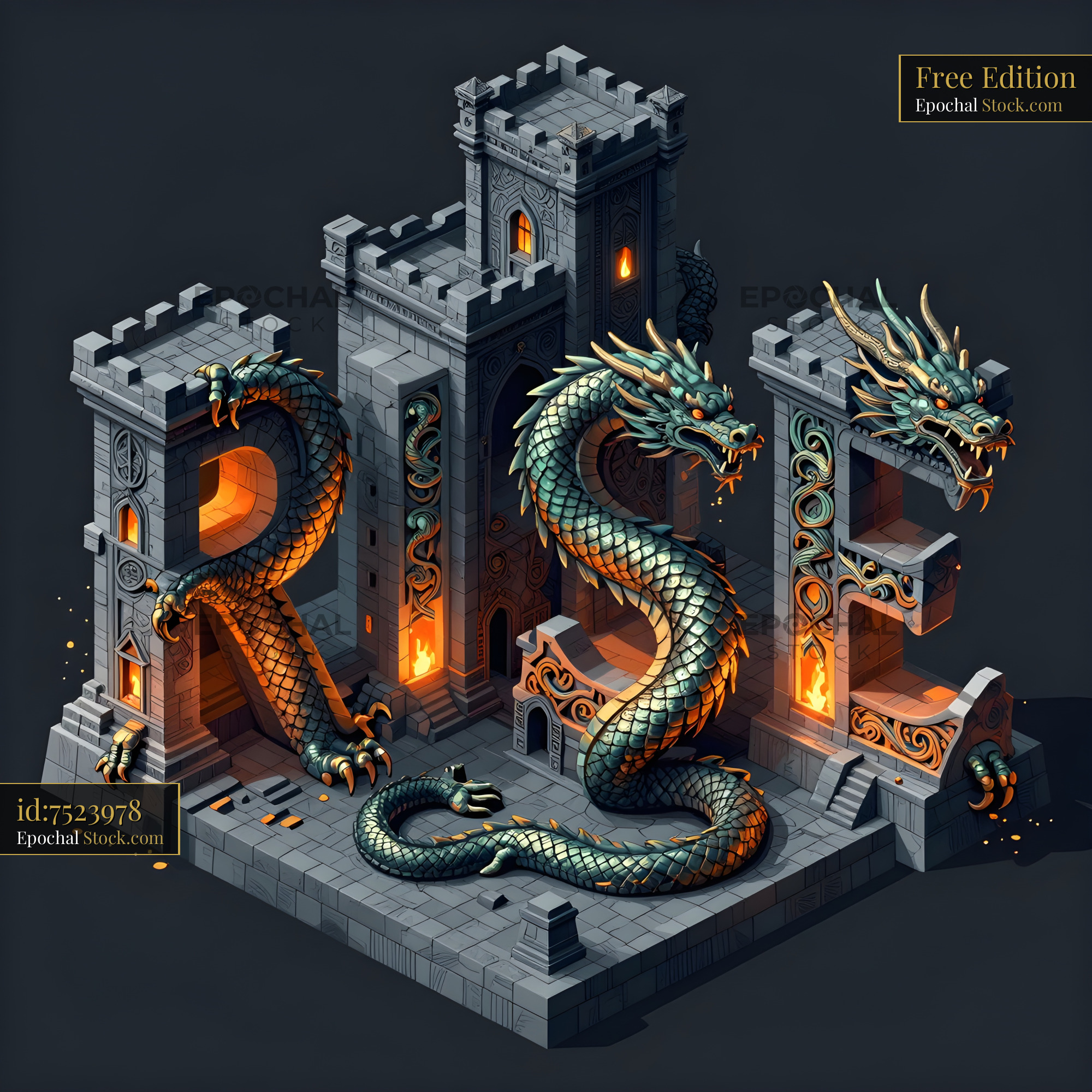 A large dragon weaves through stone towers in a fantasy setting. The towers have glowing lights. The scene shows a magical world with intricate details and bold letters.