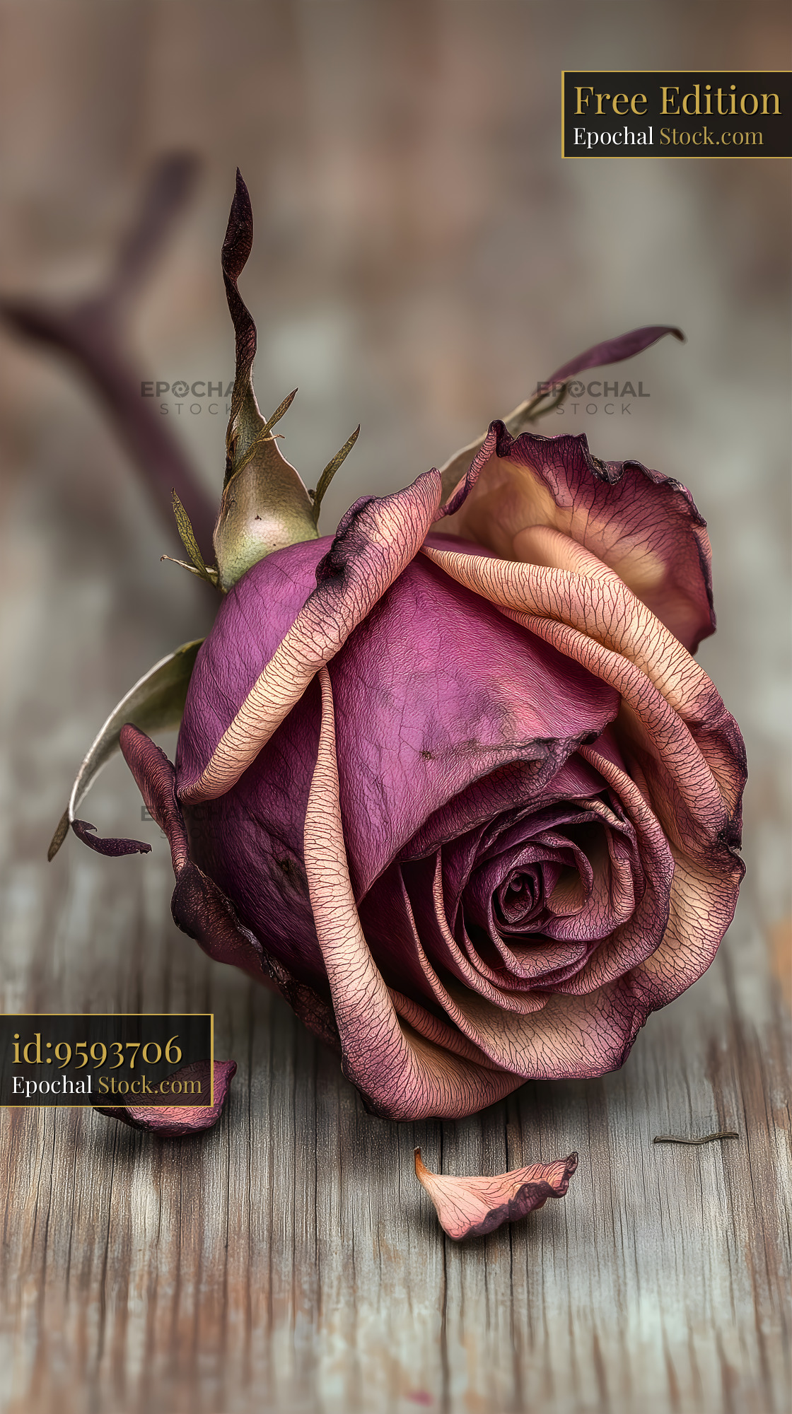 Dried purple rose on wooden surface with fallen petals Free Premium Stock Photo