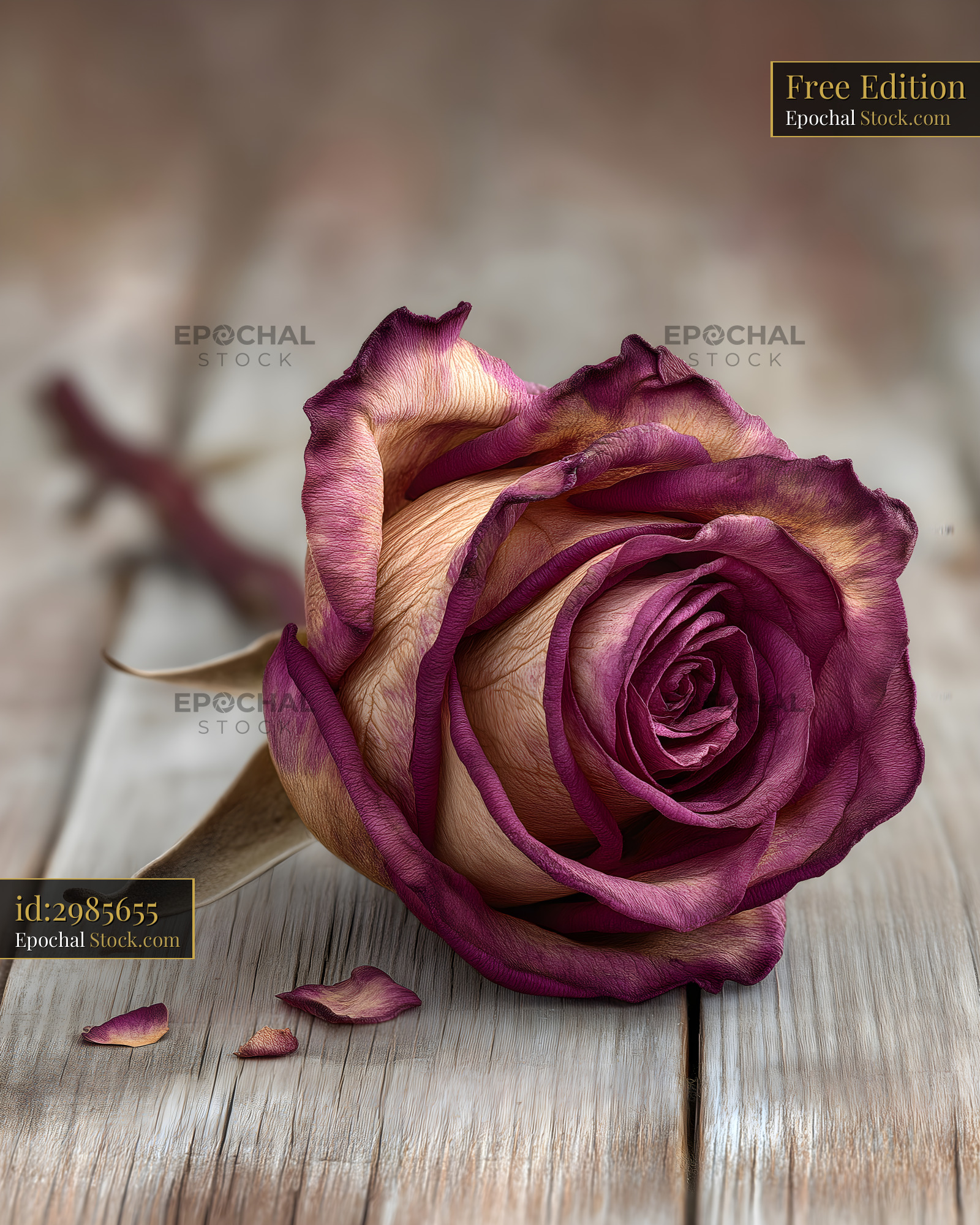 A dried rose rests on a wooden table. Its petals have faded colors and look delicate. A single petal is seen next to the rose, adding to the scene in a simple way.