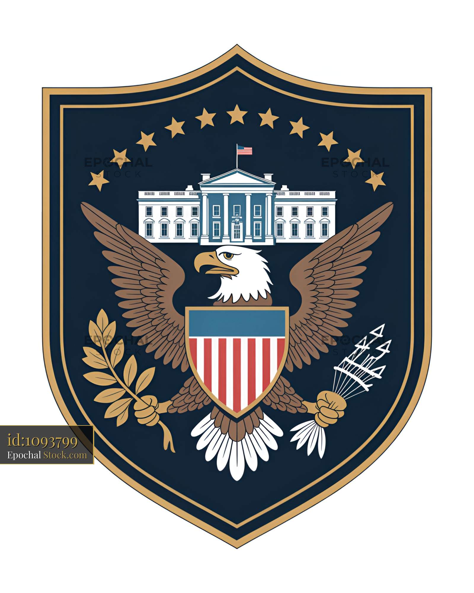 A large eagle symbol with a shield design features the White House in the background, surrounded by stars. This emblem represents patriotism and national pride.