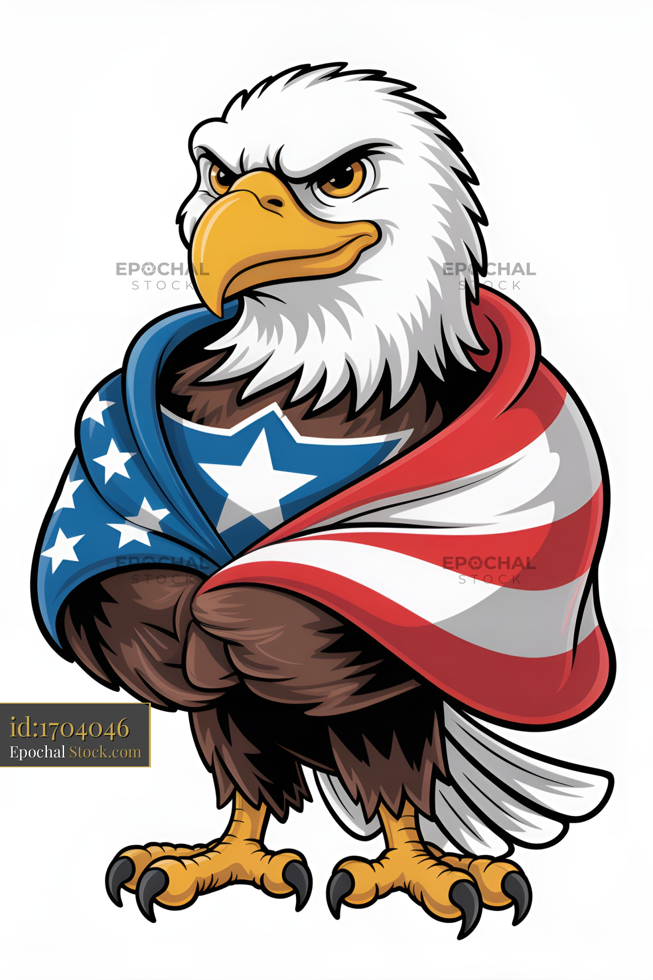 A bald eagle stands with a proud posture. It has a flag draped over its wings. The eagle looks confident and determined, representing American values and strength.
