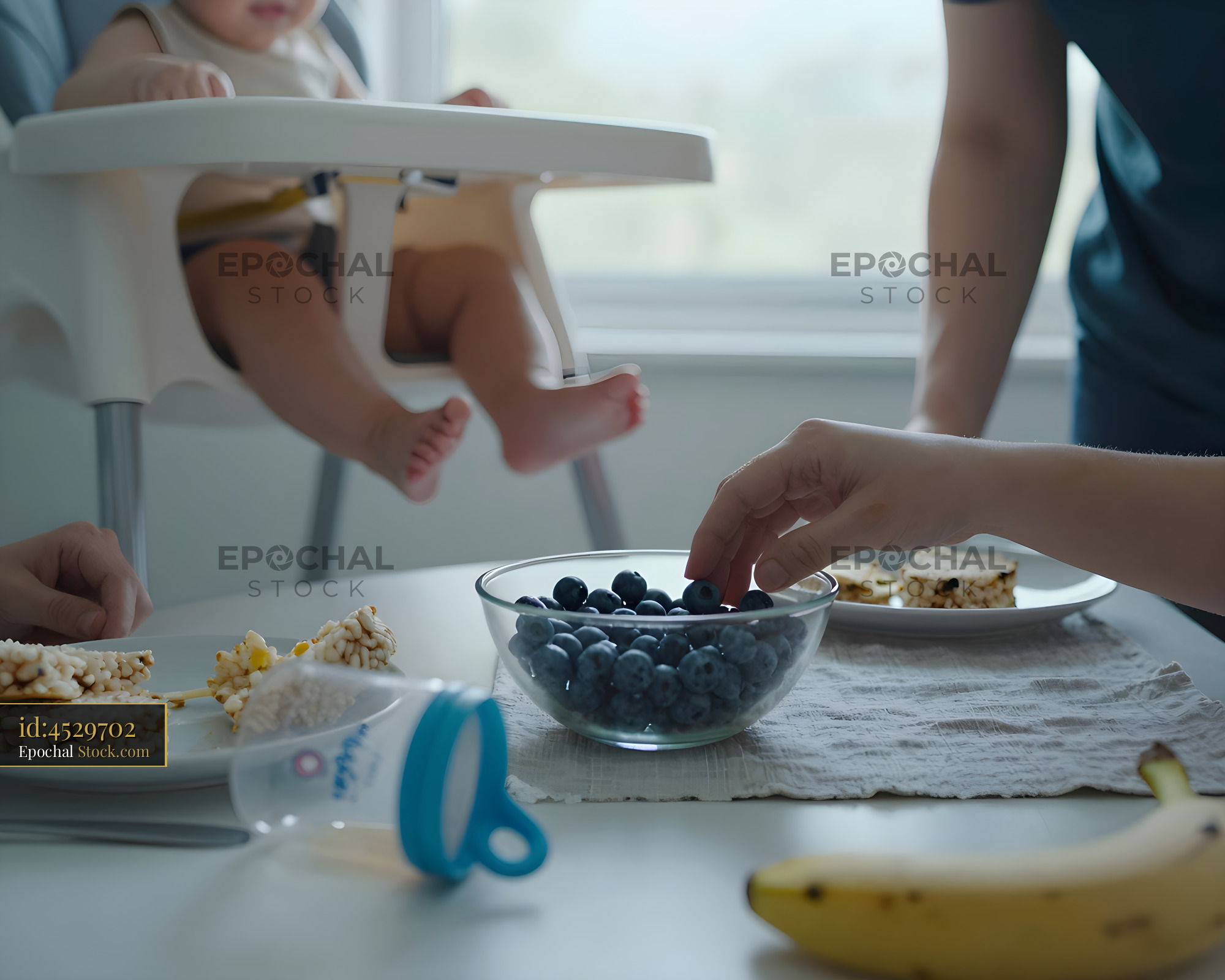 A person is picking blueberries from a bowl on the table. A child sits in a high chair nearby. Plates of food are on the table, including rice cakes and a banana. Time is morning.