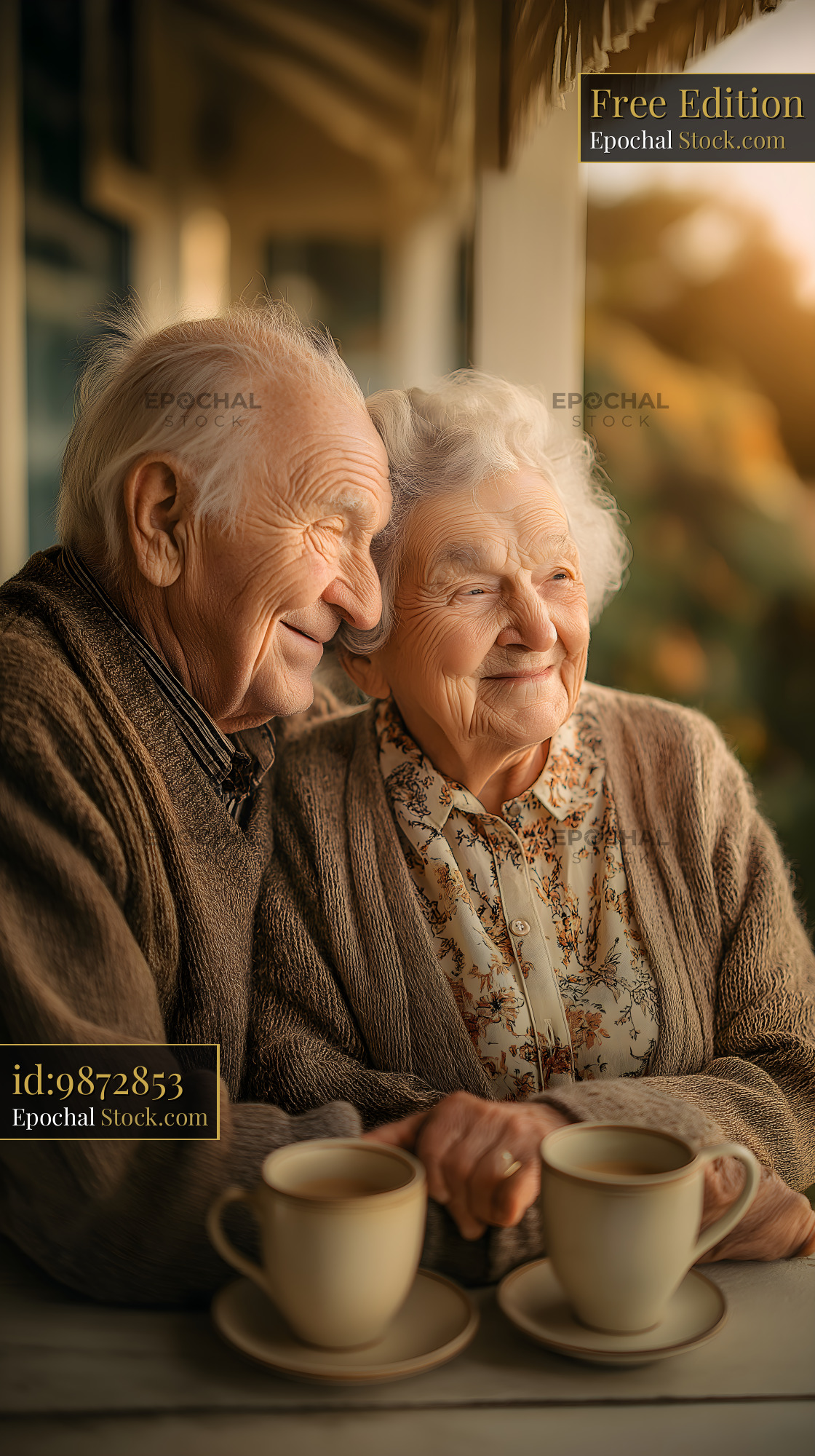 An elderly couple sits closely together at a table. They hold hands and smile at each other. Two cups are placed in front of them as the sun sets outside.