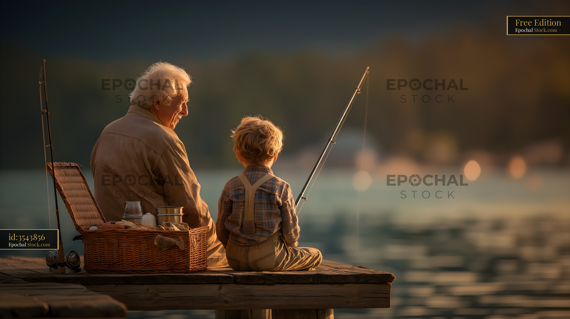 An elderly man sits with a young boy on a dock by a lake. They hold fishing rods and are focused on the water. A basket with supplies rests nearby.