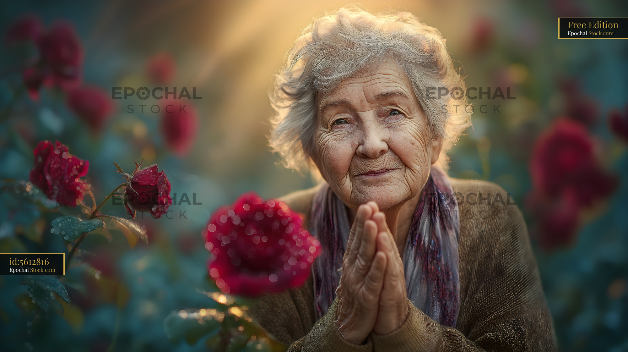An elderly woman stands in a garden filled with roses. She has her hands together and looks up with expression of joy. The sun sets behind her and casts warm light across the scene.